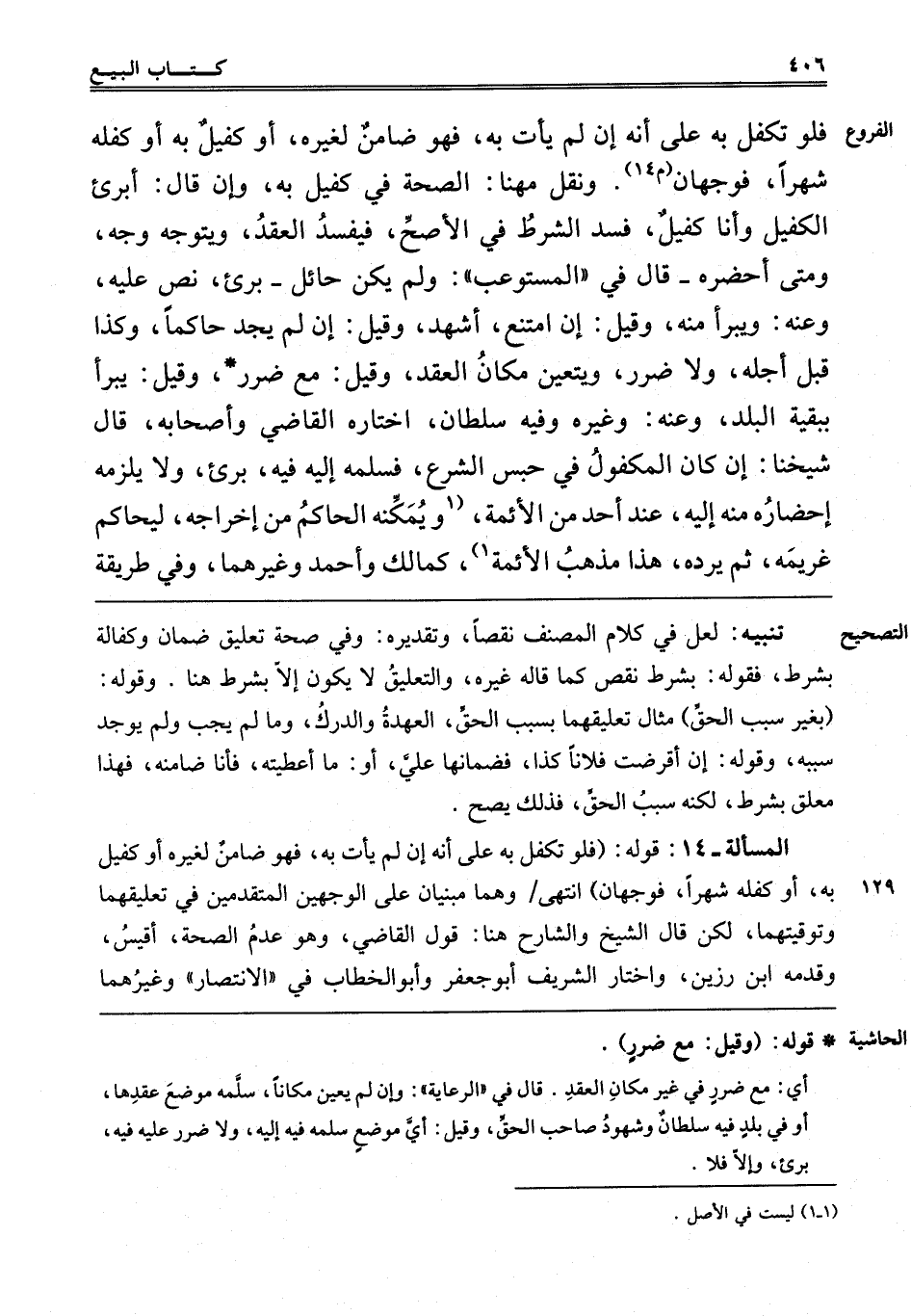 "مَسْأَلَةٌ 14" قَوْلُهُ: فَلَوْ تَكَفَّلَ بِهِ عَلَى أَنَّهُ إنْ لَمْ يَأْتِ بِهِ فَهُوَ ضَامِنٌ لِغَيْرِهِ أَوْ كَفِيلٌ بِهِ أَوْ كَفَلَهُ شَهْرًا فَوَجْهَانِ, انْتَهَى, وَهُمَا مَبْنِيَّانِ عَلَى الْوَجْهَيْنِ الْمُتَقَدِّمَيْنِ فِي تَعْلِيقِهِمَا وَتَوْقِيتِهِمَا لَكِنْ قَالَ الشَّيْخُ وَالشَّارِحُ هُنَا: قَوْلُ الْقَاضِي, وَهُوَ عَدَمُ الصِّحَّةِ أَقْيَسُ وَقَدَّمَهُ ابْنُ رَزِينٍ, وَاخْتَارَ الشَّرِيفُ أَبُو جَعْفَرٍ وَأَبُو الْخَطَّابِ فِي الانتصار وغيرهما