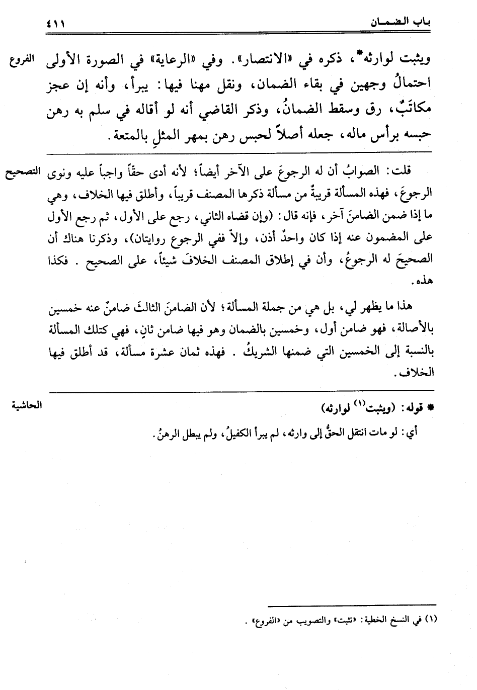 هَذَا مَا يَظْهَرُ لِي, بَلْ هِيَ مِنْ جُمْلَةِ الْمَسْأَلَةِ لِأَنَّ الضَّامِنَ الثَّالِثَ ضَامِنٌ عَنْهُ خمسين بِالْأَصَالَةِ, فَهُوَ ضَامِنٌ أَوَّلٌ, وَخَمْسِينَ بِالضَّمَانِ هُوَ فِيهَا ضَامِنٌ ثَانٍ, فَهِيَ كَتِلْكَ الْمَسْأَلَةِ بِالنِّسْبَةِ إلَى الْخَمْسِينَ الَّتِي ضَمِنَهَا الشَّرِيكُ. فَهَذِهِ ثَمَانِ عَشْرَةَ مَسْأَلَةً قَدْ أَطْلَقَ فِيهَا الْخِلَافَ.