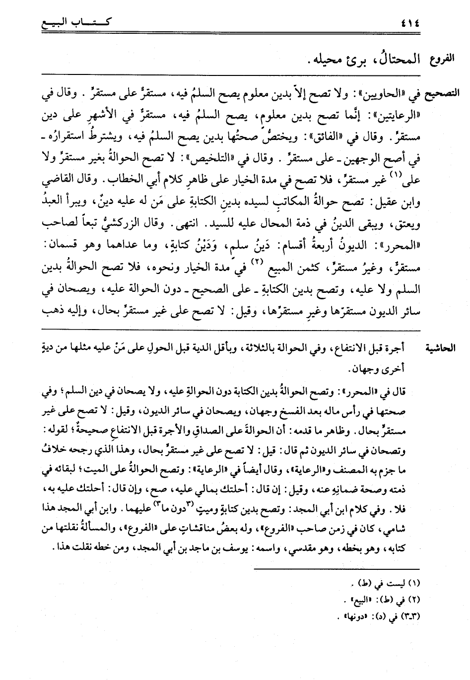 ـــــــــــــــــــــــــــــQفِي الْحَاوِيَيْنِ: وَلَا تَصِحُّ إلَّا بِدَيْنٍ مَعْلُومٍ يَصِحُّ السَّلَمُ فِيهِ مُسْتَقِرٌّ عَلَى مُسْتَقِرٍّ. وَقَالَ فِي الرِّعَايَتَيْنِ: إنَّ مَا يَصِحُّ بِدَيْنٍ مَعْلُومٍ يَصِحُّ السَّلَمُ فِيهِ مُسْتَقِرٌّ, فِي الْأَشْهَرِ, عَلَى دَيْنٍ مُسْتَقِرٍّ. وَقَالَ فِي الْفَائِقِ: وَيَخْتَصُّ صِحَّتُهَا بِدَيْنٍ يَصِحُّ السَّلَمُ فِيهِ, وَيُشْتَرَطُ اسْتِقْرَارُهُ فِي أَصَحِّ الْوَجْهَيْنِ عَلَى مُسْتَقِرٍّ. وَقَالَ فِي التَّلْخِيصِ: لَا تَصِحُّ الْحَوَالَةُ بِغَيْرِ مُسْتَقِرٍّ وَلَا غَيْرِ مُسْتَقِرٍّ, فَلَا تَصِحُّ فِي مُدَّةِ الْخِيَارِ, عَلَى ظَاهِرِ كَلَامِ أَبِي الْخَطَّابِ وَقَالَ الْقَاضِي وَابْنُ عَقِيلٍ: تَصِحُّ حَوَالَةُ الْمُكَاتَبِ لِسَيِّدِهِ بِدَيْنِ الْكِتَابَةِ عَلَى مَنْ لَهُ عَلَيْهِ دَيْنٌ وَيَبْرَأُ الْعَبْدُ وَيَعْتِقُ وَيَبْقَى الدَّيْنُ فِي ذِمَّةِ الْمُحَالِ عَلَيْهِ لِلسَّيِّدِ, انْتَهَى. وَقَالَ الزَّرْكَشِيّ تَبَعًا لِصَاحِبِ الْمُحَرَّرِ: الدُّيُونُ أَرْبَعَةُ أَقْسَامٍ: دَيْنُ سَلَمٍ, وَدَيْنُ كِتَابَةٍ, وَمَا عَدَاهُمَا وَهُوَ قِسْمَانِ: مُسْتَقِرٌّ وَغَيْرُ مُسْتَقِرٍّ, كَثَمَنِ الْبَيْعِ فِي مُدَّةِ الْخِيَارِ وَنَحْوِهِ, فَلَا تَصِحُّ الْحَوَالَةُ بِدَيْنِ السَّلَمِ وَلَا عَلَيْهِ, وَتَصِحُّ بِدَيْنِ الْكِتَابَةِ عَلَى الصَّحِيحِ دُونَ الْحَوَالَةِ عَلَيْهِ, وَيَصِحَّانِ فِي سَائِرِ الدُّيُونِ مُسْتَقِرِّهَا وَغَيْرِ مُسْتَقِرِّهَا. وَقِيلَ: لَا تَصِحُّ عَلَى غَيْرِ مُسْتَقِرٍّ بِحَالٍ, وإليه ذهب.