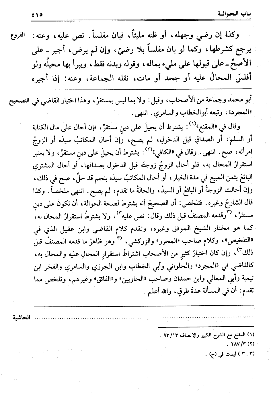 وَقَالَ فِي الْمُقْنِعِ1: يُشْتَرَطُ أَنْ يُحِيلَ عَلَى دَيْنٍ مُسْتَقِرٍّ, فَإِنْ أَحَالَ عَلَى مَالِ الْكِتَابَةِ أَوْ السَّلَمِ أَوْ الصَّدَاقِ قَبْلَ الدُّخُولِ لَمْ يَصِحَّ, وَإِنْ أَحَالَ الْمُكَاتَبُ سَيِّدَهُ أَوْ الزَّوْجُ امْرَأَتَهُ صَحَّ, انْتَهَى. وَقَالَ فِي الْكَافِي2: يُشْتَرَطُ أَنْ يُحِيلَ عَلَى دَيْنٍ مُسْتَقِرٍّ, وَلَا يُعْتَبَرُ اسْتِقْرَارُ الْمُحَالِ بِهِ, فَلَوْ أَحَالَ الزَّوْجُ زَوْجَتَهُ قَبْلَ الدُّخُولِ بِصَدَاقِهَا, أَوْ أَحَالَ الْمُشْتَرِي الْبَائِعَ بِثَمَنِ الْمَبِيعِ فِي مُدَّةِ الْخِيَارِ, أَوْ أَحَالَ الْمُكَاتَبُ سَيِّدَهُ بِنَجْمٍ قَدْ حَلَّ, صَحَّ فِي ذَلِكَ, وَإِنْ أَحَالَتْ الزَّوْجَةُ أَوْ الْبَائِعُ أَوْ السَّيِّدُ وَالْحَالَةُ مَا تَقَدَّمَ لَمْ يَصِحَّ, انْتَهَى, مُلَخَّصًا, وَكَذَا قَالَ الشَّارِحُ وَغَيْرُهُ فَتَلَخَّصَ أَنَّ الصَّحِيحَ أَنَّهُ يُشْتَرَطُ لِصِحَّةِ الْحَوَالَةِ أَنْ تَكُونَ عَلَى دين مستقر"3وَقَدَّمَهُ الْمُصَنِّفُ قَبْلَ ذَلِكَ وَقَالَ: نُصَّ عَلَيْهِ3", وَلَا يُشْتَرَطُ اسْتِقْرَارُ الْمُحَالِ بِهِ, كَمَا هُوَ مُخْتَارُ الشَّيْخِ الْمُوَفَّقِ وَغَيْرِهِ, وَتَقَدَّمَ كَلَامُ الْقَاضِي وَابْنِ عَقِيلٍ الَّذِي فِي التَّلْخِيصِ, وَكَلَامُ صَاحِبِ الْمُحَرَّرِ وَالزَّرْكَشِيِّ, "3وَهُوَ ظَاهِرُ مَا قَدَّمَهُ الْمُصَنِّفُ قَبْلَ ذَلِكَ3", وَإِنْ كَانَ اخْتِيَارُ كَثِيرٍ مِنْ الْأَصْحَابِ اشْتِرَاطَ اسْتِقْرَارِ الْمُحَالِ عَلَيْهِ وَالْمُحَالِ بِهِ, كَالْقَاضِي فِي الْمُجَرَّدِ وَالْحَلْوَانِيِّ وَأَبِي الْخَطَّابِ وَابْنِ الْجَوْزِيِّ وَالسَّامِرِيِّ وَالْفَخْرِ بْنِ تَيْمِيَّةَ وَأَبِي الْمَعَالِي وَابْنِ حَمْدَانَ وَصَاحِبِ الْحَاوِيَيْنِ وَالْفَائِقِ وَغَيْرِهِمْ, وَتَلَخَّصَ مِمَّا تَقَدَّمَ أَنَّ فِي الْمَسْأَلَةِ عِدَّةَ طُرُقٍ, والله أعلم.