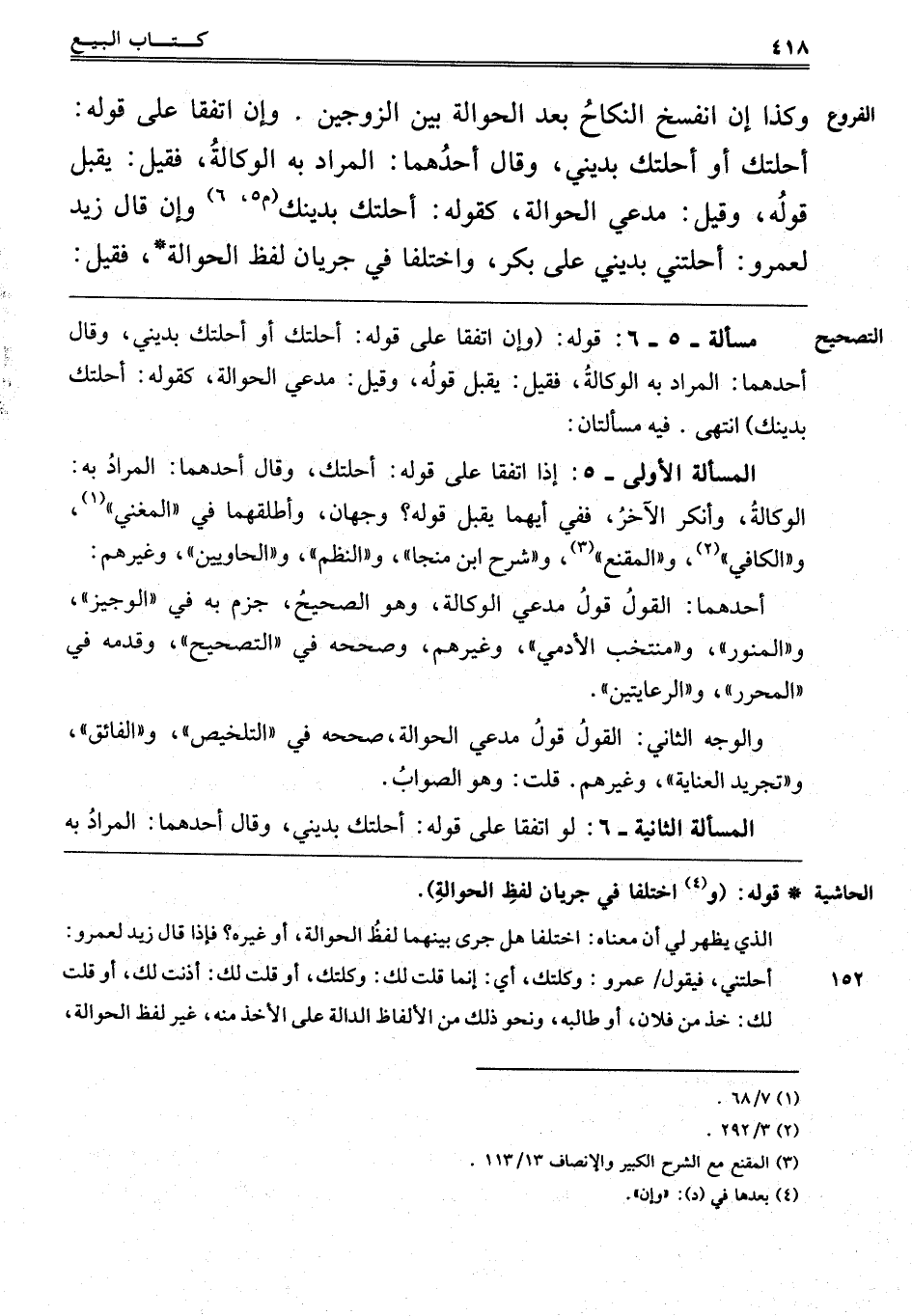 "الْمَسْأَلَةُ الْأُولَى 5" إذَا اتَّفَقَا عَلَى قَوْلِهِ أَحَلْتُك, وَقَالَ أَحَدُهُمَا: الْمُرَادُ بِهِ الْوَكَالَةُ, وَأَنْكَرَ الْآخَرُ, فَفِي أَيِّهِمَا يُقْبَلُ قَوْلُهُ؟ وَجْهَانِ, وَأَطْلَقَهَا فِي المغني1 والكافي2 والمقنع3 وشرح ابن منجا وَالنَّظْمِ وَالْحَاوِيَيْنِ وَغَيْرِهِمْ. "أَحَدُهُمَا" الْقَوْلُ قَوْلُ مُدَّعِي الْوَكَالَةِ, وَهُوَ الصَّحِيحُ, جَزَمَ بِهِ فِي الْوَجِيزِ وَالْمُنَوِّرِ وَمُنْتَخَبِ الْآدَمِيِّ وَغَيْرِهِمْ, وَصَحَّحَهُ فِي التَّصْحِيحِ, وَقَدَّمَهُ فِي الْمُحَرَّرِ وَالرِّعَايَتَيْنِ.