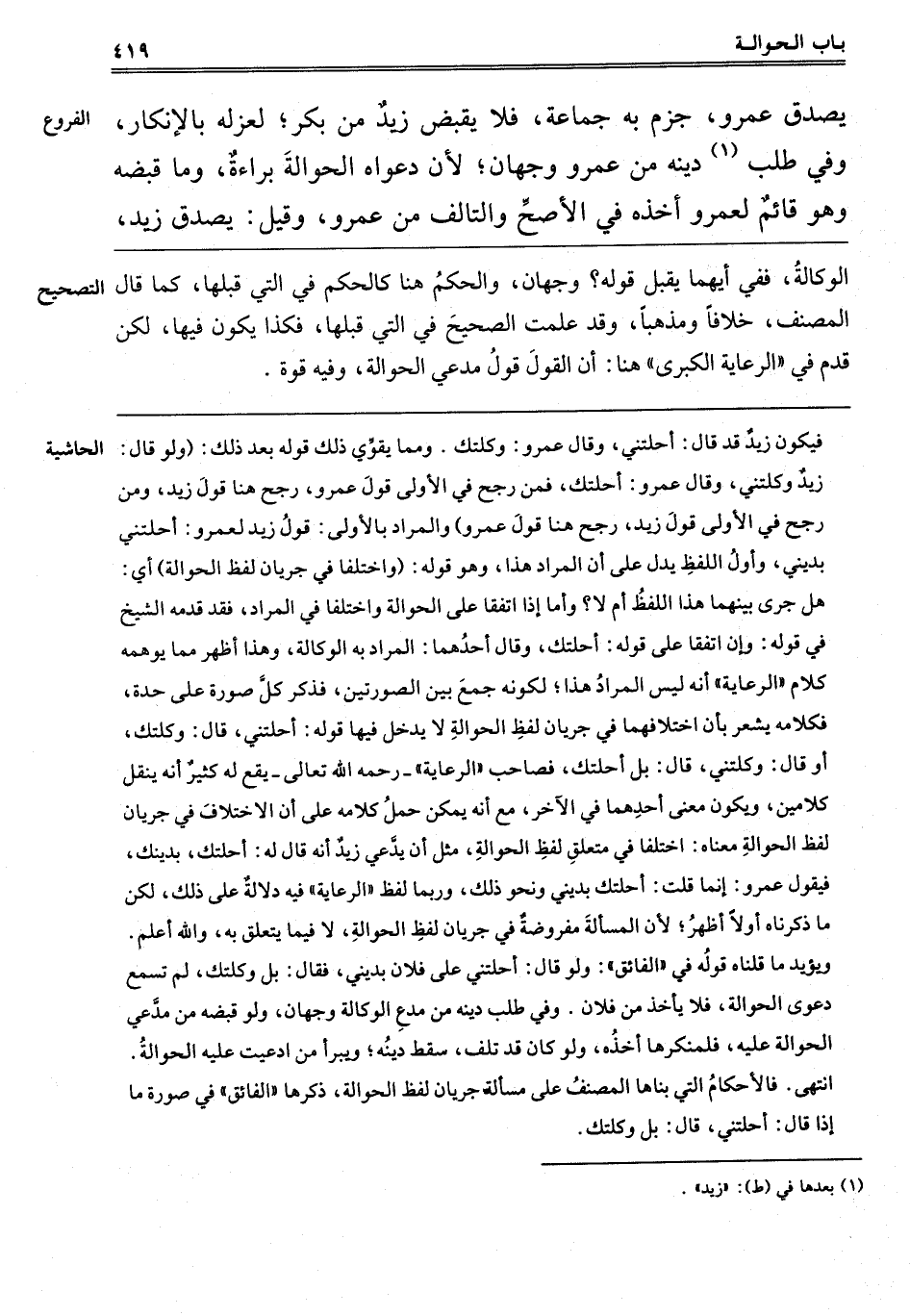 ـــــــــــــــــــــــــــــQالْوَكَالَةُ, فَفِي أَيِّهِمَا يُقْبَلُ قَوْلُهُ؟ وَجْهَانِ, وَالْحُكْمُ هُنَا كَالْحُكْمِ فِي الَّتِي قَبْلَهَا, كَمَا قَالَ الْمُصَنِّفُ, خِلَافًا وَمَذْهَبًا, وَقَدْ عَلِمْت الصَّحِيحَ فِي الَّتِي قَبْلَهَا, فَكَذَا يَكُونُ فِيهَا, لَكِنْ قَدَّمَ فِي الرِّعَايَةِ الْكُبْرَى هُنَا: أَنَّ الْقَوْلَ قَوْلُ مدعي الحوالة, وفيه قوة..