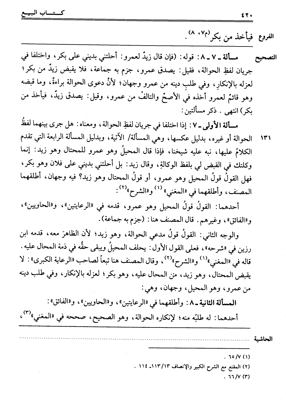 مسألة الْأُولَى-7: إذَا اخْتَلَفَا فِي جَرَيَانِ لَفْظِ الْحَوَالَةِ وَمَعْنَاهُ هَلْ جَرَى بَيْنَهُمَا لَفْظُ الْحَوَالَةِ أَوْ غَيْرُهُ بِدَلِيلِ عَكْسِهَا, وَهِيَ الْمَسْأَلَةُ الْآتِيَةُ وَبِدَلِيلِ الْمَسْأَلَةِ الرَّابِعَةِ الَّتِي تَقَدَّمَ الْكَلَامُ عَلَيْهَا, نَبَّهَ عَلَيْهِ شَيْخُنَا, فَإِذَا قَالَ الْمُحِيلُ وَهُوَ عَمْرٌو لِلْمُحْتَالِ وَهُوَ زَيْدٌ: إنَّمَا وَكَّلْتُك فِي الْقَبْضِ لِي بِلَفْظِ الْوَكَالَةِ. وَقَالَ زَيْدٌ: بَلْ أَحَلْتنِي بِدَيْنِي عَلَى فُلَانٍ وَهُوَ بَكْرٌ, فَهَلْ الْقَوْلُ قَوْلُ الْمُحِيلِ وَهُوَ عَمْرٌو, أَوْ قَوْلُ الْمُحْتَالِ وَهُوَ زَيْدٌ؟ فِيهِ وَجْهَانِ, أَطْلَقَهُمَا الْمُصَنِّفُ, وَأَطْلَقَهُمَا فِي الْمُغْنِي1 وَالشَّرْحِ2.