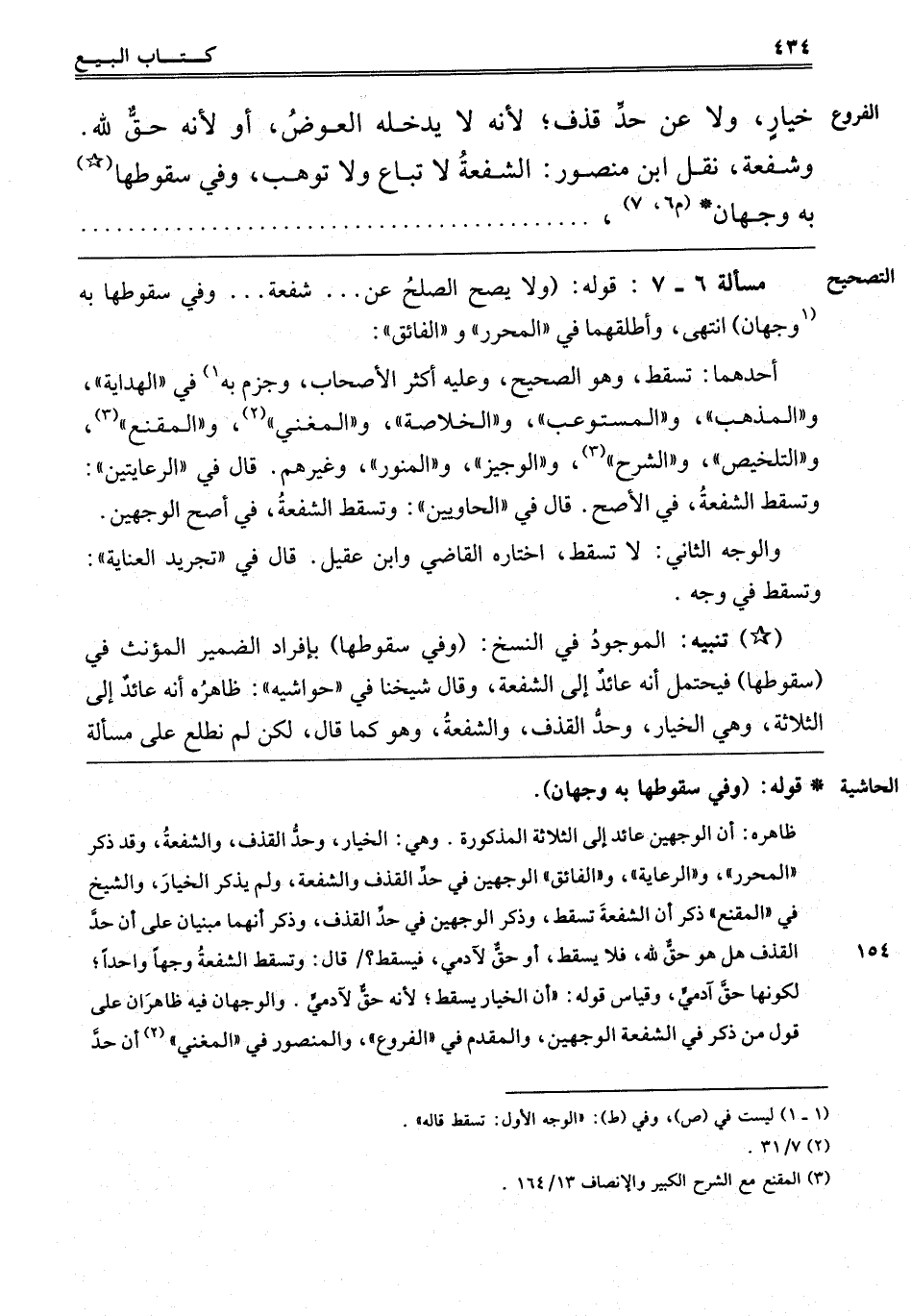 "*" تَنْبِيهٌ: الْمَوْجُودُ فِي النُّسَخِ "وَفِي سُقُوطِهَا" بِإِفْرَادِ الضَّمِيرِ, المؤنث في سُقُوطِهَا فَيُحْتَمَلُ أَنَّهُ عَائِدٌ إلَى الشُّفْعَةِ. وَقَالَ شَيْخُنَا فِي حَوَاشِيهِ: ظَاهِرُهُ أَنَّهُ عَائِدٌ إلَى الثَّلَاثَةِ, وَهِيَ الْخِيَارُ وَحَدُّ الْقَذْفِ وَالشُّفْعَةُ, وَهُوَ كَمَا قَالَ, لَكِنْ لَمْ نَطَّلِعْ عَلَى مَسْأَلَةِ