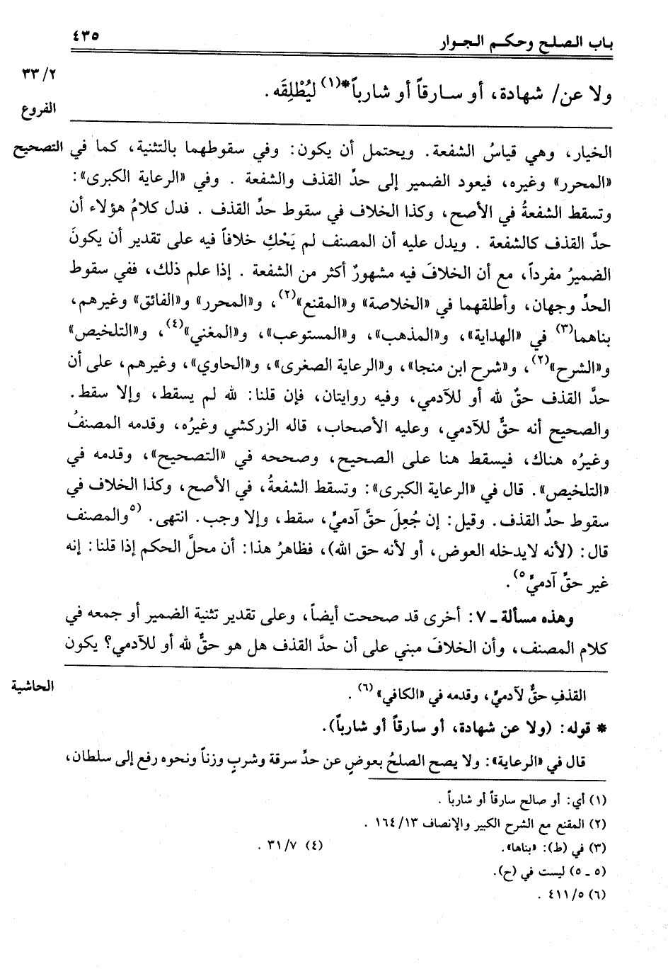 ـــــــــــــــــــــــــــــQالْخِيَارِ, وَهِيَ قِيَاسُ الشُّفْعَةِ. وَيُحْتَمَلُ أَنْ يَكُونَ "وَفِي سُقُوطِهِمَا" بِالتَّثْنِيَةِ, كَمَا فِي الْمُحَرَّرِ وَغَيْرِهِ, فَيَعُودُ الضَّمِيرُ إلَى حَدِّ الْقَذْفِ وَالشُّفْعَةِ. وَفِي الرِّعَايَةِ الْكُبْرَى: وَتَسْقُطُ الشُّفْعَةُ فِي الْأَصَحِّ, وَكَذَا الْخِلَافُ فِي سُقُوطِ حَدِّ الْقَذْفِ, فَدَلَّ كَلَامُ هَؤُلَاءِ أَنَّ حَدَّ الْقَذْفِ كَالشُّفْعَةِ. وَيَدُلُّ عَلَيْهِ أَنَّ الْمُصَنِّفَ لَمْ يَحْكِ خِلَافًا فِيهِ عَلَى تَقْدِيرِ أَنْ يَكُونَ الضَّمِيرُ مُفْرَدًا, مَعَ أَنَّ الْخِلَافَ فِيهِ مَشْهُورٌ أَكْثَرُ مِنْ الشُّفْعَةِ, إذَا عُلِمَ ذَلِكَ فَفِي سُقُوطِ الْحَدِّ وَجْهَانِ, وَأَطْلَقَهُمَا في الخلاصة والمقنع2 والمحرر والفائق وغيرهم, بناهما3 فِي الْهِدَايَةِ وَالْمُذْهَبِ وَالْمُسْتَوْعِبِ وَالْمُغْنِي4 وَالتَّلْخِيصِ وَالشَّرْحِ2 وَشَرْحِ ابْنِ مُنَجَّى وَالرِّعَايَةِ الصُّغْرَى وَالْحَاوِي وَغَيْرِهِمْ عَلَى أَنَّ حَدَّ الْقَذْفِ حَقٌّ لِلَّهِ أَوْ لِلْآدَمِيِّ. وَفِيهِ رِوَايَتَانِ, فَإِنْ قُلْنَا: لِلَّهِ, لَمْ يَسْقُطْ, وَإِلَّا سَقَطَ. وَالصَّحِيحُ أَنَّهُ حَقٌّ لِلْآدَمِيِّ, وَعَلَيْهِ الْأَصْحَابُ, قَالَهُ الزَّرْكَشِيّ وَغَيْرُهُ, وَقَدَّمَهُ الْمُصَنِّفُ وَغَيْرُهُ هُنَاكَ, فَيَسْقُطُ هُنَا عَلَى الصَّحِيحِ, وَصَحَّحَهُ فِي التَّصْحِيحِ, وَقَدَّمَهُ فِي التَّلْخِيصِ. قَالَ فِي الرِّعَايَةِ الْكُبْرَى: وَتَسْقُطُ الشُّفْعَةُ, فِي الْأَصَحِّ, وَكَذَا الْخِلَافُ فِي سُقُوطِ حَدِّ الْقَذْفِ. وَقِيلَ: إنْ جُعِلَ حَقُّ آدَمِيٍّ سَقَطَ وَإِلَّا وَجَبَ, انْتَهَى. "5وَالْمُصَنِّفُ قَالَ لِأَنَّهُ لَا يَدْخُلُهُ الْعِوَضُ, أَوْ لِأَنَّهُ حَقٌّ لِلَّهِ, فَظَاهِرُ هَذَا أَنَّ مَحَلَّ الْحُكْمِ إذَا قُلْنَا إنَّهُ غَيْرُ حَقِّ آدَمِيٍّ5".