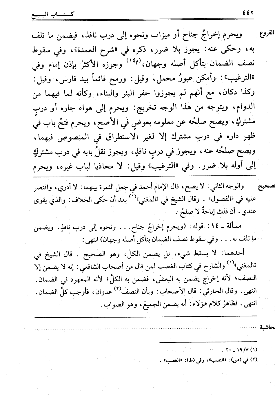 "مَسْأَلَةٌ 14" قَوْلُهُ: وَيَحْرُمُ إخْرَاجُ جَنَاحٍ, وَنَحْوِهِ إلَى دَرْبٍ نَافِذٍ, وَيَضْمَنُ مَا تَلِفَ بِهِ, وَفِي سُقُوطِ نِصْفِ الضَّمَانِ بِتَأَكُّلِ أَصْلِهِ وَجْهَانِ, انْتَهَى "أَحَدُهُمَا" لَا يَسْقُطُ شَيْءٌ بَلْ يَضْمَنُ الْكُلَّ, وَهُوَ الصَّحِيحُ. قَالَ الشَّيْخُ فِي الْمُغْنِي وَالشَّارِحُ فِي كِتَابِ الْغَصْبِ لِمَنْ قَالَ مِنْ أَصْحَابِ الشَّافِعِيِّ إنَّهُ لَا يَضْمَنُ إلَّا النِّصْفَ لِأَنَّهُ إخْرَاجٌ يَضْمَنُ بِهِ الْبَعْضَ فَضَمِنَ بِهِ الْكُلَّ, لِأَنَّهُ الْمَعْهُودُ فِي الضَّمَانِ, انْتَهَى. وَقَالَ الْحَارِثِيُّ: قال الأصحاب وبأن النصف2 عُدْوَانٌ فَأَوْجَبَ كُلَّ الضَّمَانِ, انْتَهَى. فَظَاهِرُ كَلَامِ هؤلاء أنه يضمن الجميع وهو الصواب