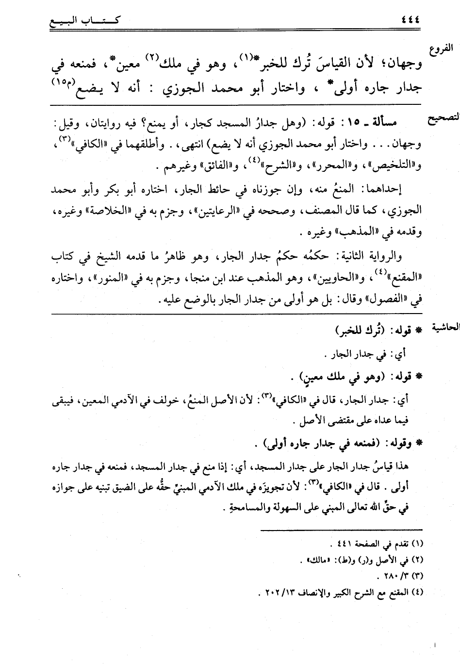 ـــــــــــــــــــــــــــــQ"مَسْأَلَةٌ 15" قَوْلُهُ: وَهَلْ جِدَارُ الْمَسْجِدِ كَجَارٍ أَوْ يُمْنَعُ؟ فِيهِ رِوَايَتَانِ, وَقِيلَ: وَجْهَانِ, وَاخْتَارَ أَبُو مُحَمَّدٍ الْجَوْزِيُّ أَنَّهُ لَا يَضَعُ, انْتَهَى. وَأَطْلَقَهُمَا فِي الْكَافِي3 وَالتَّلْخِيصِ وَالْمُحَرَّرِ وَالشَّرْحِ4 وَالْفَائِقِ وَغَيْرِهِمْ.