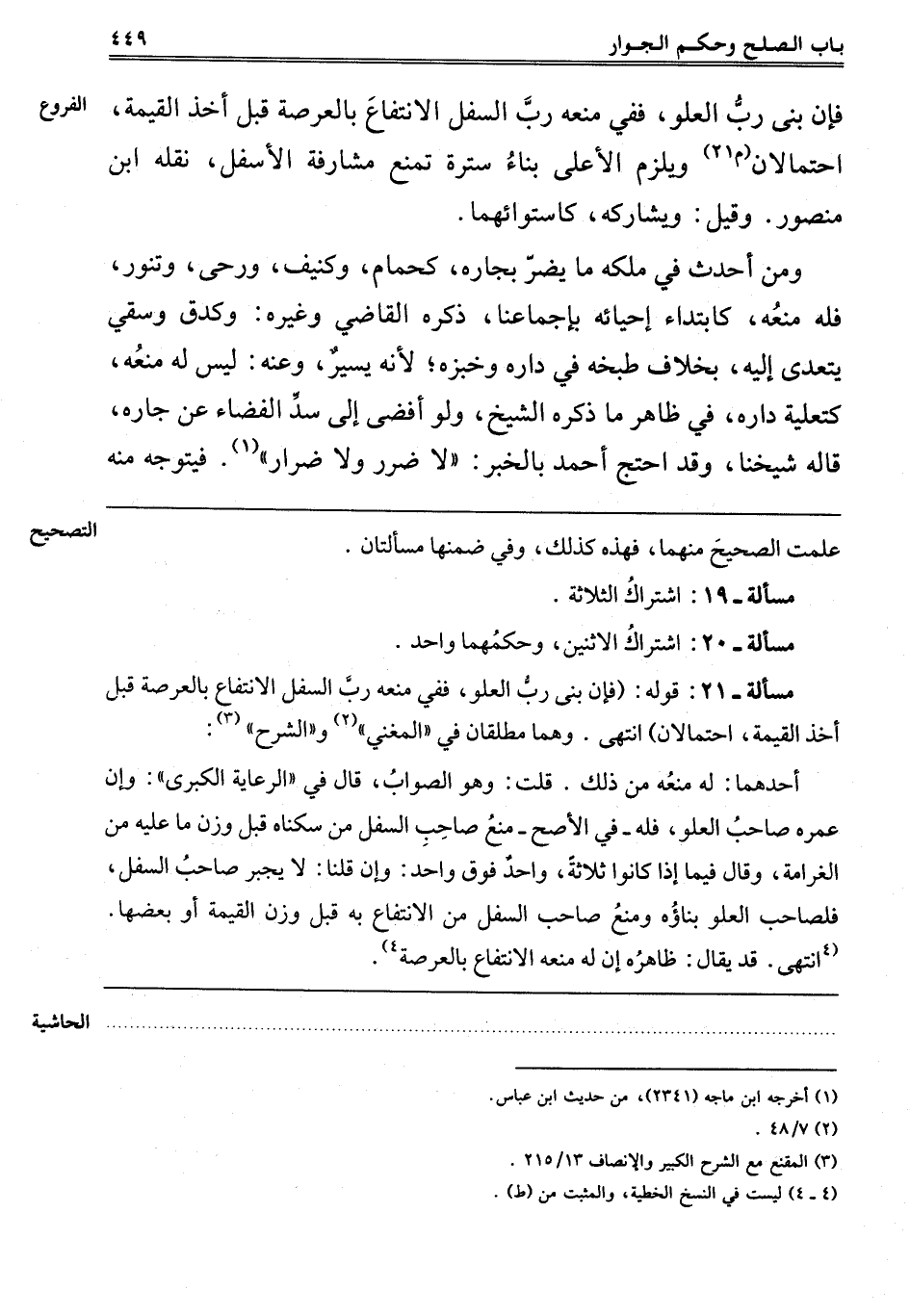 "مَسْأَلَةٌ 21" قَوْلُهُ: وَإِنْ بَنَى رَبُّ العلو ففي منعه رب السفل الانتفاع بالعرصة قَبْلَ أَخْذِ الْقِيمَةِ احْتِمَالَانِ, انْتَهَى. وَهُمَا مُطْلَقَانِ فِي الْمُغْنِي2 وَالشَّرْحِ3.