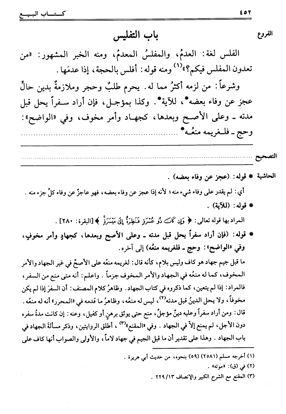 وَشَرْعًا: مَنْ لَزِمَهُ أَكْثَرُ مِمَّا لَهُ يَحْرُمُ طَلَبٌ وَحَجْرٌ وَمُلَازَمَةٌ بِدَيْنٍ حَالٍّ عَجَزَ عَنْ وَفَاءِ بَعْضِهِ, لِلْآيَةِ, وَكَذَا بِمُؤَجَّلٍ, فَإِنْ أَرَادَ سَفَرًا يَحِلُّ قَبْلَ مُدَّتِهِ وَعَلَى الْأَصَحِّ وَبَعْدَهَا, كَجِهَادٍ وَأَمْرٍ مَخُوفٍ. وفي الواضح: وحج فلغريمه منعه