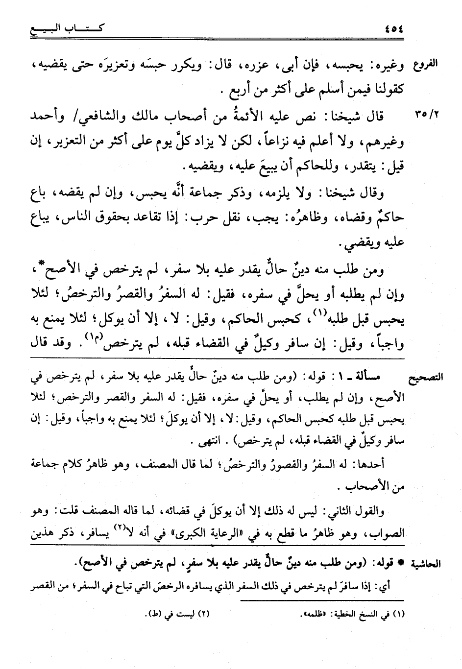 وَمَنْ طُلِبَ مِنْهُ دَيْنٌ حَالٌّ يُقَدَّرُ عَلَيْهِ بِلَا سَفَرٍ لَمْ يَتَرَخَّصْ, فِي الْأَصَحِّ, وَإِنْ لَمْ يَطْلُبْهُ أَوْ يَحِلَّ فِي سَفَرِهِ فَقِيلَ: لَهُ السَّفَرُ وَالْقَصْرُ وَالتَّرَخُّصُ, لِكَيْ لَا يُحْبَسَ قَبْلَ طَلَبِهِ1 كَحَبْسِ الْحَاكِمِ, وَقِيلَ: لَا, إلَّا أَنْ يُوَكِّلَ, لِئَلَّا يَمْنَعَ بِهِ وَاجِبًا, وَقِيلَ: إنْ سَافَرَ وَكِيلٌ فِي الْقَضَاءِ قَبْلَهُ لَمْ يَتَرَخَّصْ "م 1". وقد قال