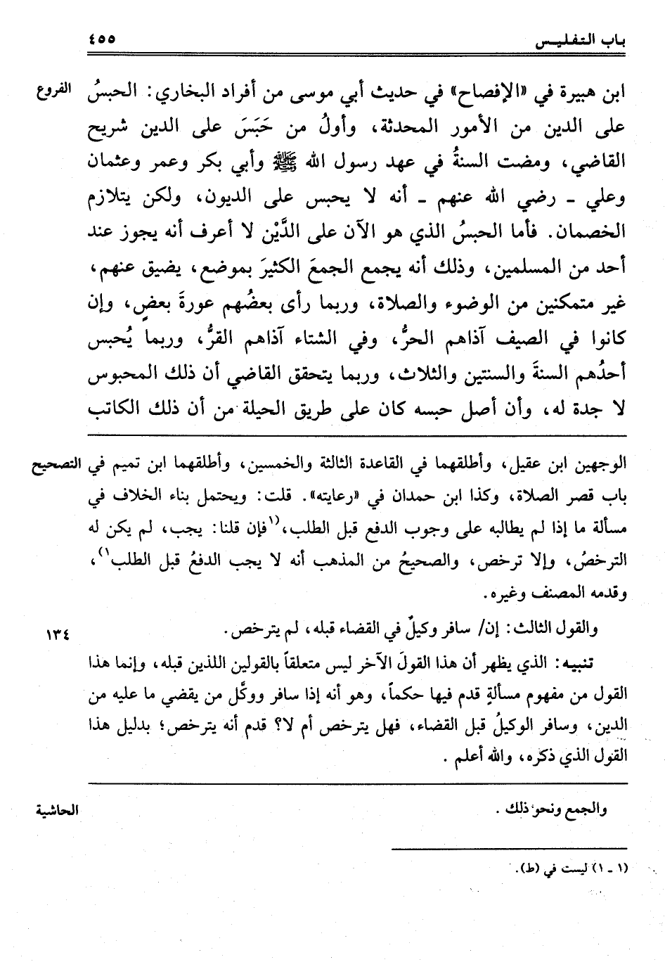 ابْنُ هُبَيْرَةَ فِي الْإِفْصَاحِ فِي حَدِيثِ أَبِي مُوسَى مِنْ إفْرَادِ الْبُخَارِيِّ: الْحَبْسُ عَلَى الدَّيْنِ مِنْ الْأُمُورِ الْمُحْدَثَةِ, وَأَوَّلُ مَنْ حَبِسَ عَلَى الدَّيْنِ شُرَيْحٌ الْقَاضِي, وَمَضَتْ السُّنَّةُ فِي عَهْدِ رَسُولِ اللَّهِ صَلَّى اللَّهُ عَلَيْهِ وَسَلَّمَ وَأَبِي بَكْرٍ وَعُمَرَ وَعُثْمَانَ وَعَلِيٍّ رَضِيَ اللَّهُ عَنْهُمْ أَنَّهُ لَا يُحْبَسُ عَلَى الدُّيُونِ وَلَكِنْ يَتَلَازَمُ الْخَصْمَانِ, فَأَمَّا الْحَبْسُ الَّذِي هُوَ الْآنَ عَلَى الدَّيْنِ لَا أَعْرِفُ أَنَّهُ يَجُوزُ عِنْدَ أَحَدٍ مِنْ الْمُسْلِمِينَ, وَذَلِكَ أَنَّهُ يُجْمَعُ الْجَمْعُ الْكَثِيرُ بموضع يضيق عَنْهُمْ غَيْرُ مُتَمَكِّنِينَ مِنْ الْوُضُوءِ وَالصَّلَاةِ, وَرُبَّمَا رَأَى بَعْضُهُمْ عَوْرَةَ بَعْضٍ, وَإِنْ كَانُوا فِي الصَّيْفِ آذَاهُمْ الْحَرُّ, وَفِي الشِّتَاءِ آذَاهُمْ الْقُرُّ, وَرُبَّمَا يُحْبَسُ أَحَدُهُمْ السَّنَةَ وَالسَّنَتَيْنِ وَالثَّلَاثَ, وَرُبَّمَا يَتَحَقَّقُ الْقَاضِي أَنَّ ذَلِكَ الْمَحْبُوسَ لَا جُدَّةَ لَهُ, وَأَنَّ أَصْلَ حَبْسِهِ كَانَ عَلَى طَرِيقِ الحيلة من أن ذلك الكاتب