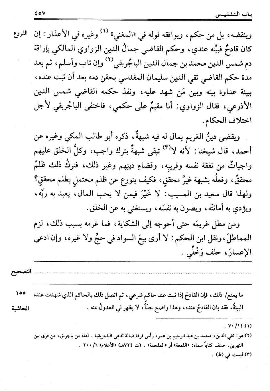 وَيَنْقُضُهُ بَلْ مِنْ حُكْمٍ, وَيُوَافِقُهُ قَوْلَهُ فِي الْمُغْنِي1 وَغَيْرِهِ فِي الْأَعْذَارِ: إنْ كَانَ قَادِحٌ فَبَيِّنْهُ عِنْدِي, وَحَكَمَ الْقَاضِي جَمَالُ الدِّينِ الزَّوَاوِيُّ الْمَالِكِيُّ بِإِرَاقَةِ دَمِ شَمْسِ الدِّينِ مُحَمَّدِ بْنِ جَمَالِ الدِّينِ الْبَاجِرْبَقِيُّ2 وَإِنْ تَابَ وَأَسْلَمَ, ثُمَّ بَعْدَ مُدَّةٍ حَكَمَ الْقَاضِي تَقِيُّ الدِّينِ سُلَيْمَانُ الْمَقْدِسِيُّ بِحَقْنِ دَمِهِ بَعْدَ أَنْ ثَبَتَ عِنْدَهُ بِبَيِّنَةٍ عَدَاوَةٌ بَيْنَهُ وَبَيْنَ مَنْ شَهِدَ عَلَيْهِ, وَنَفَّذَ حُكْمَهُ الْقَاضِي شَمْسُ الدِّينِ الْأَذْرَعِيُّ, فَقَالَ الزَّوَاوِيُّ: أَنَا مُقِيمٌ عَلَى حُكْمِي, فَاخْتَفَى الْبَاجِرْبَقِيُّ لِأَجْلِ اخْتِلَافِ الْحُكَّامِ.