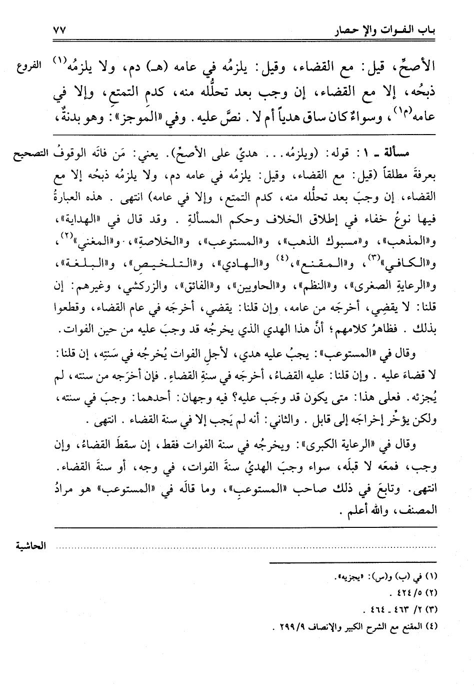 ـــــــــــــــــــــــــــــQ"مَسْأَلَةٌ 1" قَوْلُهُ: وَيَلْزَمُهُ هَدْيٌ عَلَى الْأَصَحِّ يَعْنِي مَنْ فَاتَهُ الْوُقُوفُ بِعَرَفَةَ مُطْلَقًا قِيلَ: مَعَ الْقَضَاءِ, وَقِيلَ: يَلْزَمُهُ فِي عَامِهِ دَمٌ, وَلَا يَلْزَمُهُ ذَبْحُهُ إلَّا مَعَ الْقَضَاءِ إنْ وَجَبَ بَعْدَ تَحَلُّلِهِ مِنْهُ, كَدَمِ التَّمَتُّعِ, وَإِلَّا فِي عَامِهِ, انْتَهَى. هَذِهِ الْعِبَارَةُ فِيهَا نَوْعُ خَفَاءٍ فِي إطْلَاقِ الْخِلَافِ وَحُكْمِ الْمَسْأَلَةِ, وَقَدْ قَالَ فِي الْهِدَايَةِ وَالْمُذْهَبِ وَمَسْبُوكِ الذَّهَبِ وَالْمُسْتَوْعِبِ وَالْخُلَاصَةِ وَالْمُغْنِي2 وَالْكَافِي3 وَالْمُقْنِعِ4 وَالْهَادِي وَالتَّلْخِيصِ وَالْبُلْغَةِ وَالرِّعَايَةِ الصُّغْرَى وَالنَّظْمِ وَالْحَاوِيَيْنِ وَالْفَائِقِ وَالزَّرْكَشِيِّ وَغَيْرِهِمْ: إنْ قُلْنَا لَا يَقْضِي أَخْرَجَهُ مِنْ عَامِهِ, وَإِنْ قُلْنَا يَقْضِي أَخْرَجَهُ فِي عَامِ الْقَضَاءِ, وَقَطَعُوا بِذَلِكَ, فَظَاهِرُ كَلَامِهِمْ أَنَّ هَذَا الْهَدْيَ الَّذِي يُخْرِجُهُ قَدْ وَجَبَ عَلَيْهِ مِنْ حِينِ الْفَوَاتِ. وَقَالَ فِي الْمُسْتَوْعِبِ: يَجِبُ عَلَيْهِ هَدْيٌ لِأَجْلِ الْفَوَاتِ يُخْرِجُهُ فِي سَنَتِهِ إنْ قُلْنَا: لَا قَضَاءَ عَلَيْهِ. وَإِنْ قُلْنَا: عَلَيْهِ الْقَضَاءُ, أَخْرَجَهُ فِي سَنَةِ الْقَضَاءِ, فَإِنْ أَخْرَجَهُ مِنْ سَنَتِهِ لَمْ يُجْزِئْهُ, فَعَلَى هَذَا مَتَى يَكُونُ قَدْ وَجَبَ عَلَيْهِ؟ فِيهِ وَجْهَانِ: "أَحَدُهُمَا" وَجَبَ فِي سَنَتِهِ وَلَكِنْ يُؤَخِّرُ إخْرَاجَهُ إلَى قَابِلٍ. "وَالثَّانِي": أَنَّهُ لَمْ يَجِبْ إلَّا فِي سَنَةِ الْقَضَاءِ, انْتَهَى. وَقَالَ فِي الرِّعَايَةِ الْكُبْرَى: وَيُخْرِجُهُ فِي سَنَةِ الْفَوَاتِ فَقَطْ إنْ سَقَطَ الْقَضَاءُ, وَإِنْ وَجَبَ فَمَعَهُ لَا قَبْلَهُ, سَوَاءٌ وَجَبَ الْهَدْيُ سَنَةَ الْفَوَاتِ, فِي وَجْهٍ, أَوْ سَنَةَ الْقَضَاءِ, انْتَهَى. وَتَابَعَ فِي ذَلِكَ صَاحِبَ الْمُسْتَوْعِبِ, وَمَا قَالَهُ فِي الْمُسْتَوْعِبِ هُوَ مُرَادُ الْمُصَنِّفِ, وَاَللَّهُ أعلم