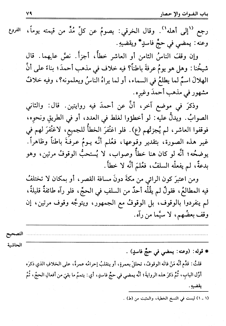 وَذَكَرَ فِي مَوْضِعٍ آخَرَ أَنَّ عَنْ أَحْمَدَ فِيهِ رِوَايَتَيْنِ, قَالَ: وَالثَّانِي الصَّوَابُ. وَيَدُلُّ عليه لو أخطئوا: الغلط. فِي الْعَدَدِ أَوْ فِي الطَّرِيقِ وَنَحْوِهِ فَوَقَفُوا الْعَاشِرَ لَمْ يُجْزِئْهُمْ "ع" فَلَوْ اُغْتُفِرَ الْخَطَأُ لِلْجَمِيعِ لَاغْتُفِرَ لَهُمْ فِي غَيْرِ هَذِهِ الصُّورَةِ بِتَقْدِيرِ وُقُوعِهَا, فَعُلِمَ أَنَّهُ يَوْمَ عَرَفَةَ بَاطِنًا وَظَاهِرًا, يُوَضِّحُهُ أَنَّهُ لَوْ كَانَ هُنَا خَطَأٌ وَصَوَابٌ لَا يُسْتَحَبُّ الْوُقُوفُ مَرَّتَيْنِ, وَهُوَ بِدْعَةٌ, لَمْ يَفْعَلْهُ السَّلَفُ, فَعُلِمَ أَنَّهُ لَا خَطَأَ,