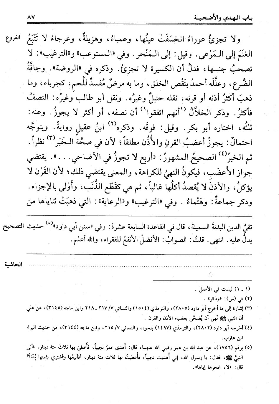 3 إشارة إلى ما خرج أبو داود "2805", والترمذي "1504" والنسائي 7/217-218 وابن ماجه "3145", عن عَلِيٍّ أَنَّ النَّبِيَّ صَلَّى اللَّهُ عَلَيْهِ وَسَلَّمَ نَهَى أن يضحي بعضباء الأذن والقرن.