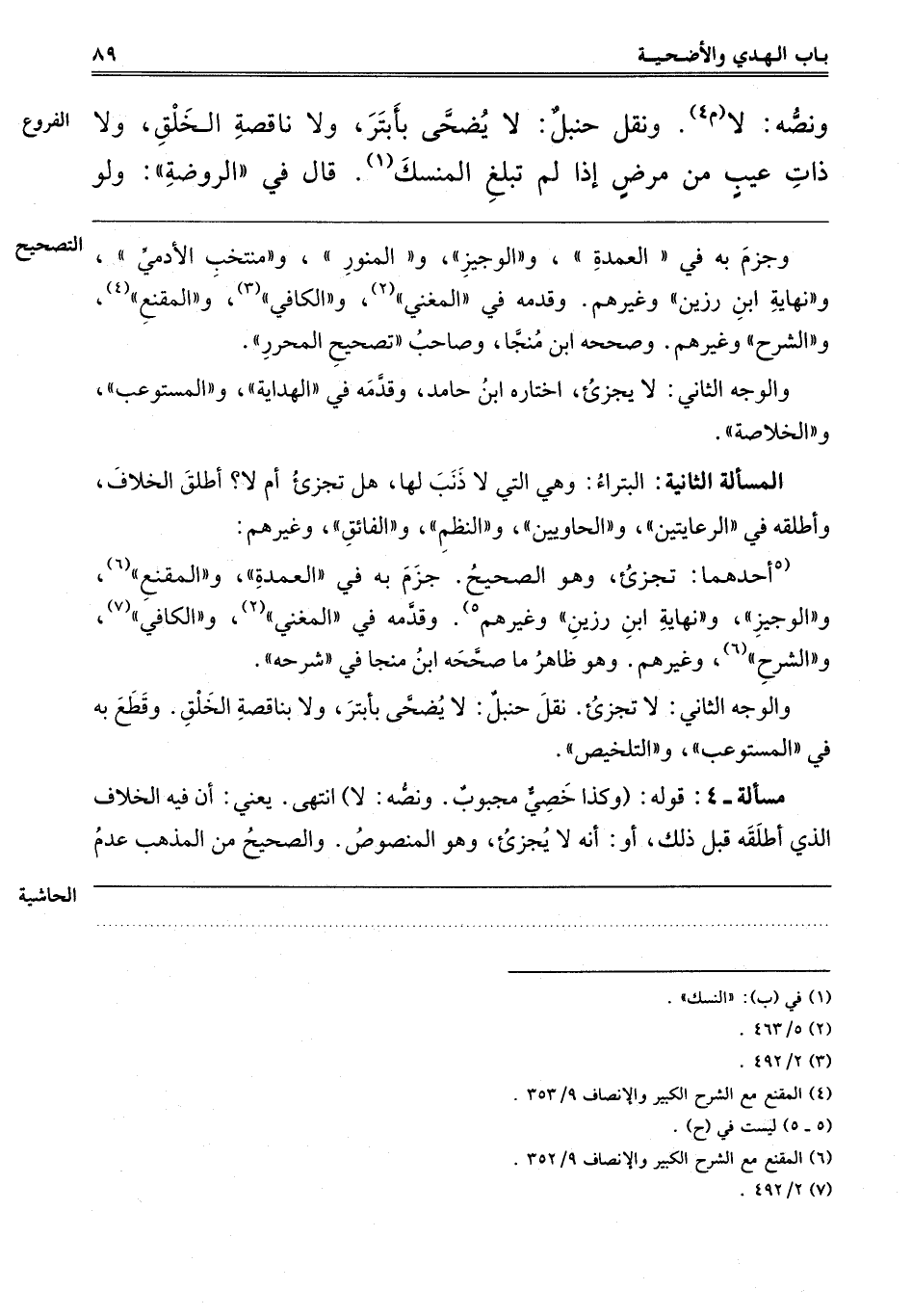 "الْمَسْأَلَةُ الثَّانِيَةُ 3" الْبَتْرَاءُ وَهِيَ الَّتِي لَا ذَنَبَ لَهَا هَلْ تُجْزِئُ أَمْ لَا؟ أَطْلَقَ الْخِلَافَ, وَأَطْلَقَهُ فِي الرِّعَايَتَيْنِ وَالْحَاوِيَيْنِ وَالنَّظْمِ وَالْفَائِقِ وَغَيْرِهِمْ, أَحَدُهُمَا تُجْزِئُ, وَهُوَ الصَّحِيحُ جَزَمَ بِهِ فِي الْعُمْدَةِ وَالْمُقْنِعِ وَالْوَجِيزِ وَنِهَايَةِ ابْنِ رَزِينٍ وَغَيْرِهِمْ, وَقَدَّمَهُ فِي الْمُغْنِي الْكَافِي وَالشَّرْحِ وَغَيْرِهِمْ, وَهُوَ ظَاهِرُ مَا صَحَّحَهُ ابْنُ مُنَجَّى فِي شَرْحِهِ. وَالْوَجْهُ الثَّانِي لَا تُجْزِئُ نَقَلَ حَنْبَلٌ: لَا يُضَحِّي بِأَبْتَرَ وَلَا بِنَاقِصَةِ الْخَلْقِ, وَقَطَعَ بِهِ فِي الْمُسْتَوْعِبِ وَالتَّلْخِيصِ.