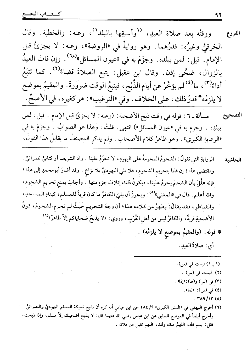 ـــــــــــــــــــــــــــــQ.مَسْأَلَةٌ 6" قَوْلُهُ فِي وَقْتِ ذَبْحِ الْأُضْحِيَّةِ: وَعَنْهُ: يُجْزِئُ قَبْلَ الْإِمَامِ, قِيلَ: لِمَنْ بِبَلَدِهِ, وَجَزَمَ بِهِ فِي عُيُونِ الْمَسَائِلِ, انْتَهَى. "قُلْت": وَهَذَا هُوَ الصَّوَابُ, وَجَزَمَ بِهِ فِي الرِّعَايَةِ الْكُبْرَى, وَهُوَ ظَاهِرُ كَلَامِ الْأَصْحَابِ, وَلَمْ يَذْكُرْ الْمُصَنِّفُ ما يقابل هذا القول,