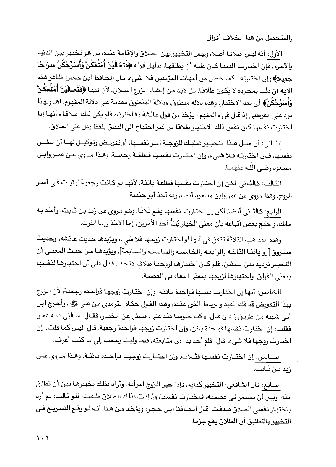 الأول: أنه ليس طلاقًا أصلاً، وليس التخيير بين الطلاق والإقامة عنده، بل هو تخيير بين الدنيا والآخرة، فإن اختارت الدنيا كان عليه أن يطلقها، بدليل قوله (فتعالين أمتعكن وأسرحكن سراحًا جميلاً) وإن اختارته - كما حصل من أمهات المؤمنين فلا شيء. قال الحافظ ابن حجر: ظاهر هذه الآية أن ذلك بمجرده لا يكون طلاقًا، بل لا بد من إنشاء الزوج الطلاق، لأن فيها (فتعالين أمتعكن وأسرحكن) أي بعد الاختيار، وهذه دلالة منطوق، ودلالة المنطوق مقدمة على دلالة المفهوم. اهـ. وبهذا يرد على القرطبي إذ قال في "المفهم" يؤخذ من قول عائشة "فاخترناه فلم يكن ذلك طلاقًا" أنها إذا اختارت نفسها كان نفس ذلك الاختيار طلاقًا من غير احتياج إلى النطق بلفظ يدل على الطلاق.