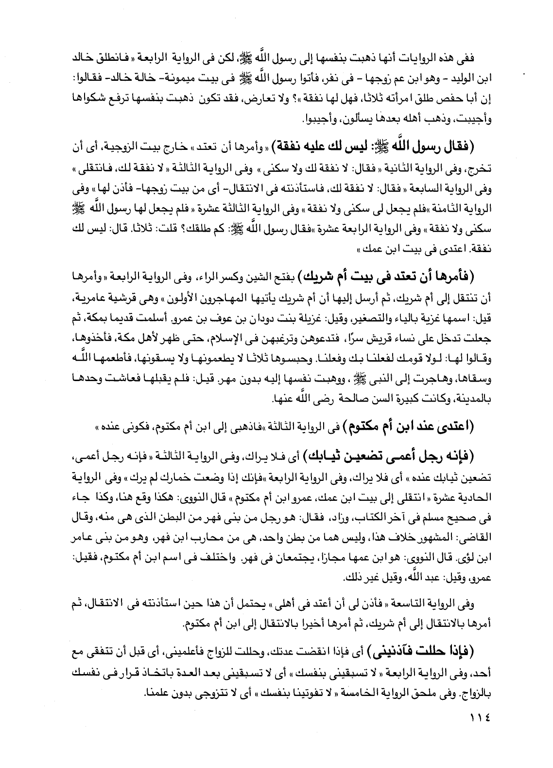(فقال رسول اللَّه صلى الله عليه وسلم: ليس لك عليه نفقة) "وأمرها أن تعتد" خارج بيت الزوجية، أي أن تخرج، وفي الرواية الثانية "فقال: لا نفقة لك ولا سكنى" وفي الرواية الثالثة "لا نفقة لك، فانتقلي" وفي الرواية السابعة "فقال: لا نفقة لك، فاستأذنته في الانتقال - أي من بيت زوجها - فأذن لها" وفي الرواية الثامنة "فلم يجعل لي سكنى ولا نفقة" وفي الرواية الثالثة عشرة "فلم يجعل لها رسول الله صلى الله عليه وسلم سكنى ولا نفقة" وفي الرواية الرابعة عشرة "فقال رسول الله صلى الله عليه وسلم: كم طلقك؟ قلت: ثلاثًا. قال: ليس لك نفقة. اعتدي في بيت ابن عمك".