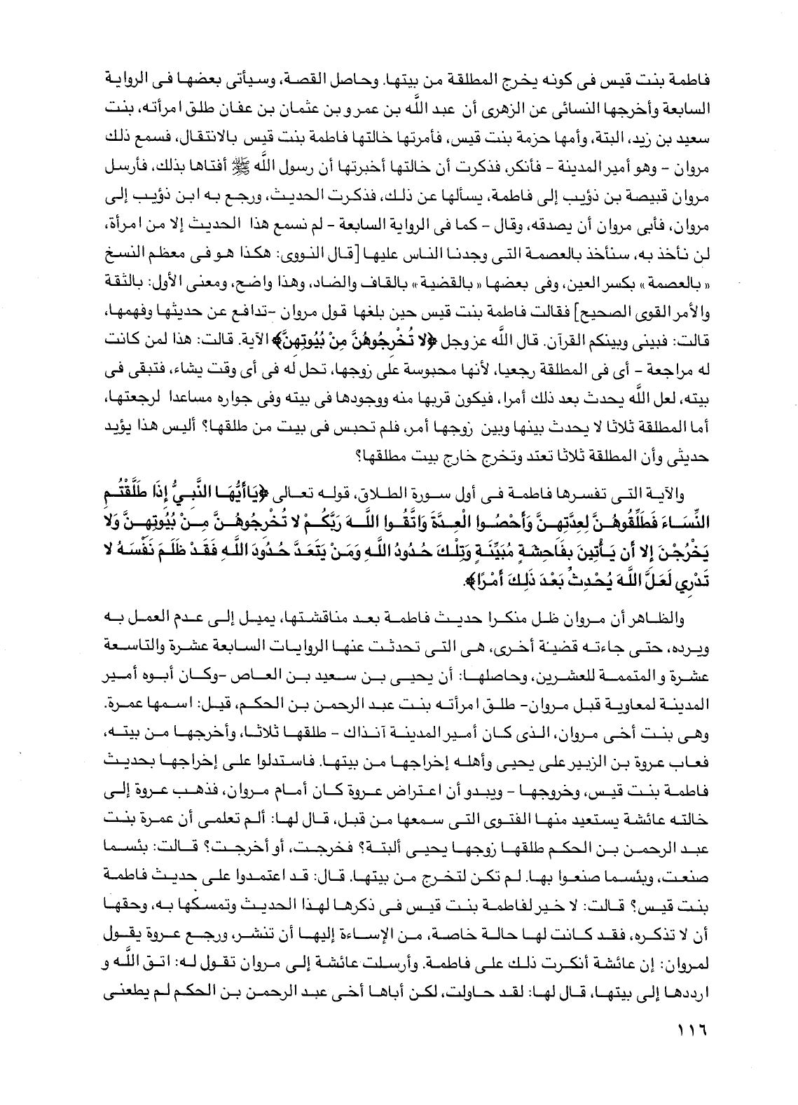 فاطمة بنت قيس في كونه يخرج المطلقة من بيتها. وحاصل القصة، وسيأتي بعضها في الرواية السابعة وأخرجها النسائي عن الزهري أن عبد الله بن عمرو بن عثمان بن عفان طلق امرأته، بنت سعيد بن زيد، البتة، وأمها حزمة بنت قيس، فأمرتها خالتها فاطمة بنت قيس بالانتقال، فسمع ذلك مروان - وهو أمير المدينة - فأنكر، فذكرت أن خالتها أخبرتها أن رسول الله صلى الله عليه وسلم أفتاها بذلك، فأرسل مروان قبيصة بن ذؤيب إلى فاطمة، يسألها عن ذلك، فذكرت الحديث، ورجع به ابن ذؤيب إلى مروان، فأبى مروان أن يصدقه، وقال - كما في الرواية السابعة - لم نسمع هذا الحديث إلا من امرأة، لن نأخذ به، سنأخذ بالعصمة التي وجدنا الناس عليها [قال النووي: هكذا هو في معظم النسخ "بالعصمة" بكسر العين، وفي بعضها "بالقضية" بالقاف والضاد، وهذا واضح، ومعنى الأول: بالثقة والأمر القوي الصحيح] فقالت فاطمة بنت قيس حين بلغها قول مروان - تدافع عن حديثها وفهمها، قالت: فبيني وبينكم القرآن. قال الله عز وجل {لا تخرجوهن من بيوتهن} الآية. قالت: هذا لمن كانت له مراجعة - أي في المطلقة رجعيًا، لأنها محبوسة على زوجها، تحل له في أي وقت يشاء، فتبقى في بيته، لعل الله يحدث بعد ذلك أمرًا، فيكون قربها منه ووجودها في بيته وفي جواره مساعدًا لرجعتها، أما المطلقة ثلاثًا لا يحدث بينها وبين زوجها أمر، فلم تحبس في بيت من طلقها؟ أليس هذا يؤيد حديثي وأن المطلقة ثلاثًا تعتد وتخرج خارج بيت مطلقها؟