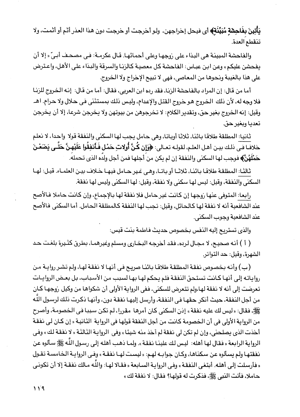(ب) وأنه بخصوص نفقة المطلقة طلاقًا بائنًا صريح في أنها لا نفقة لها، ولم تشر رواية من رواياته إلى أنها كانت تستحق النفقة فلم يحكم لها بها لسبب من الأسباب، بل بعض الروايات تعرضت إلى أنه لا نفقة لها، ولم تتعرض للسكنى، ففي الرواية الأولى أن شكواها من وكيل زوجها كان من أجل النفقة، حيث أنكر حقها في النفقة، وأرسل إليها نفقة دون، وأنها ذكرت ذلك لرسول الله صلى الله عليه وسلم، فقال: "ليس لك عليه نفقة" إذن السكنى كان أمرها مقررًا، لم تكن سببًا في الخصومة، وأصرح من الرواية الأولى في أن الخصومة كانت من أجل النفقة قولها في الرواية الثانية "إن كان لي نفقة أخذت الذي يصلحني، وإن لم تكن لي نفقة لم آخذ منه شيئًا" وفي الرواية الثالثة "لا نفقة لك" وفي الرواية الرابعة "فقال لها أهله: ليس لك علينا نفقة". ولما ذهب أهله إلى رسول الله صلى الله عليه وسلم سألوه عن نفقتها ولم يسألوه عن سكناها، وكان جوابه لهم: "ليست لها نفقة" وفي الرواية الخامسة تقول "فأرسلت إلى أهله. أبتغي النفقة" وفي الرواية السابعة "فقالا لها: والله ما لك نفقة إلا أن تكوني حاملا، فأتت النبي صلى الله عليه وسلم، فذكرت له قولها؟ فقال: لا نفقة لك".