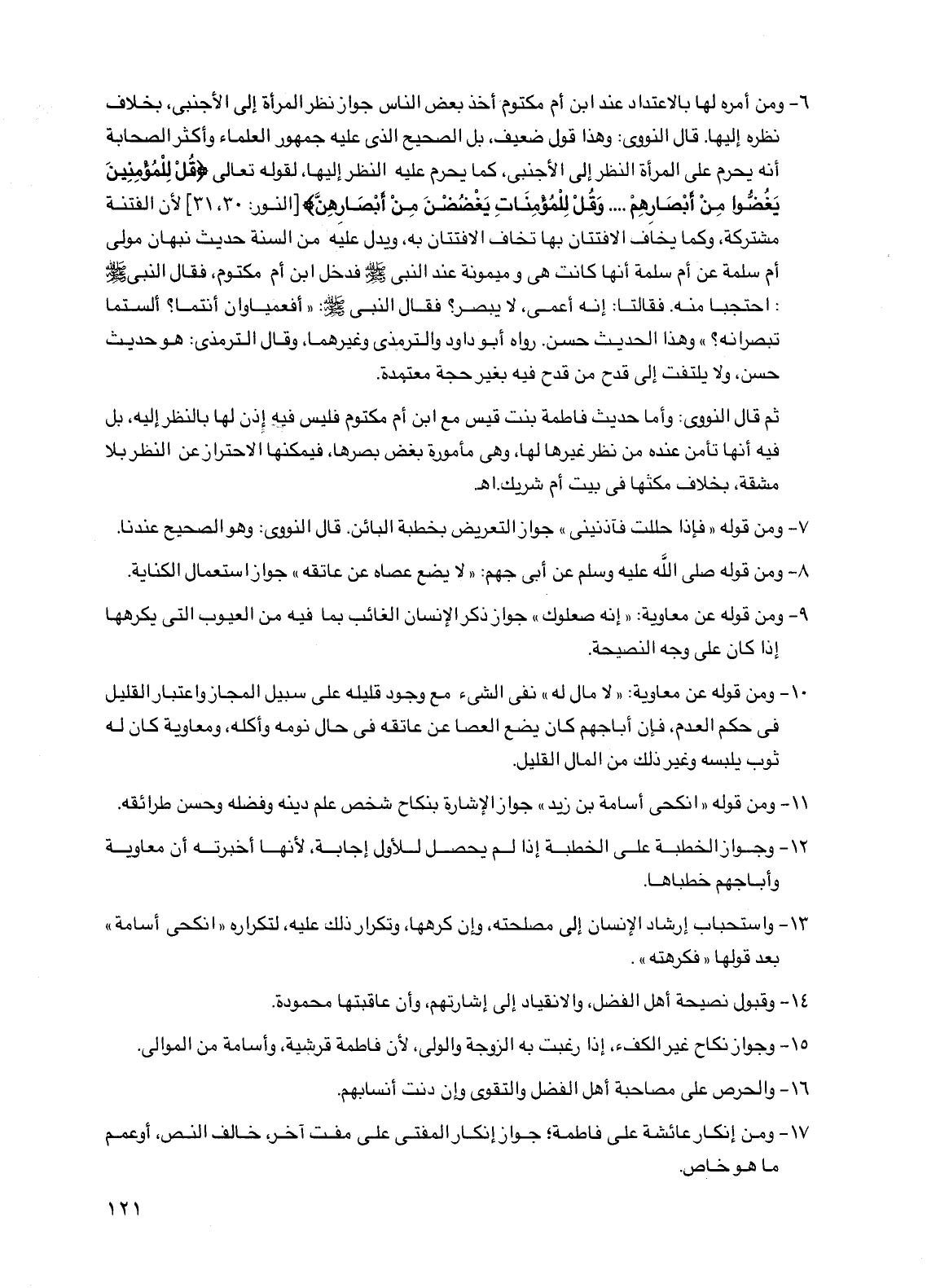 6 - ومن أمره لها بالاعتداد عند ابن أم مكتوم أخذ بعض الناس جواز نظر المرأة إلى الأجنبي، بخلاف نظره إليها. قال النووي: وهذا قول ضعيف، بل الصحيح الذي عليه جمهور العلماء وأكثر الصحابة أنه يحرم على المرأة النظر إلى الأجنبي، كما يحرم عليه النظر إليها، لقوله تعالى {قل للمؤمنين يغضوا من أبصارهم .... وقل للمؤمنات يغضضن من أبصارهن} [النور: 30، 31] لأن الفتنة مشتركة، وكما يخاف الافتتان بها تخاف الافتتان به، ويدل عليه من السنة حديث نبهان مولى أم سلمة عن أم سلمة أنها كانت هي وميمونة عند النبي صلى الله عليه وسلم فدخل ابن أم مكتوم، فقال النبي صلى الله عليه وسلم: احتجبا منه. فقالتا: إنه أعمى، لا يبصر؟ فقال النبي صلى الله عليه وسلم: "أفعمياوان أنتما؟ ألستما تبصرانه؟ " وهذا الحديث حسن. رواه أبو داود والترمذي وغيرهما، وقال الترمذي: هو حديث حسن، ولا يلتفت إلى قدح من قدح فيه بغير حجة معتمدة.