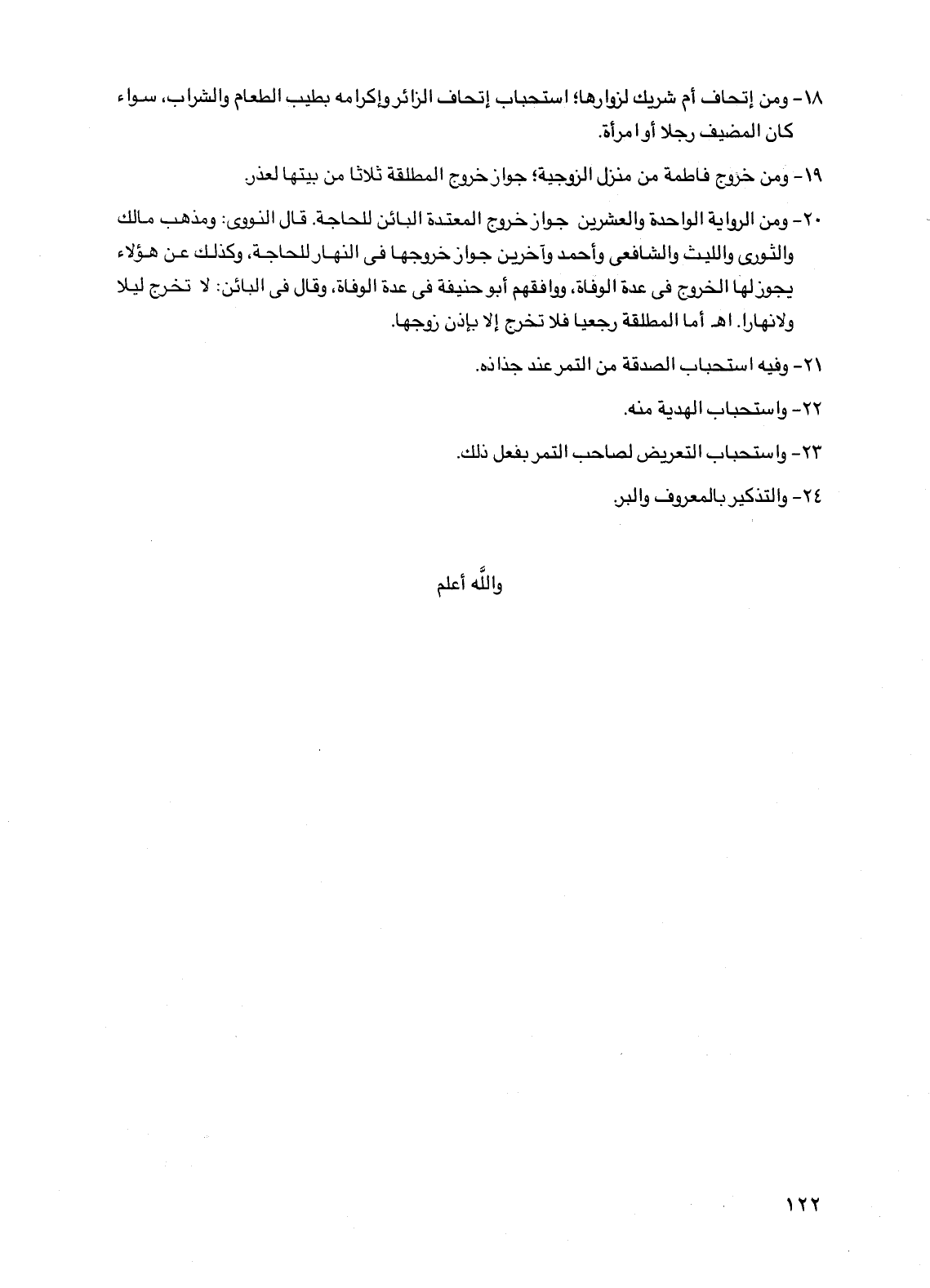 20 - ومن الرواية الواحدة والعشرين جواز خروج المعتدة البائن للحاجة. قال النووي: ومذهب مالك والثوري والليث والشافعي وأحمد وآخرين جواز خروجها في النهار للحاجة، وكذلك عن هؤلاء يجوز لها الخروج في عدة الوفاة، ووافقهم أبو حنيفة في عدة الوفاة، وقال في البائن: لا تخرج ليلاً ولا نهارًا. اهـ. أما المطلقة رجعيًا فلا تخرج إلا بإذن زوجها.