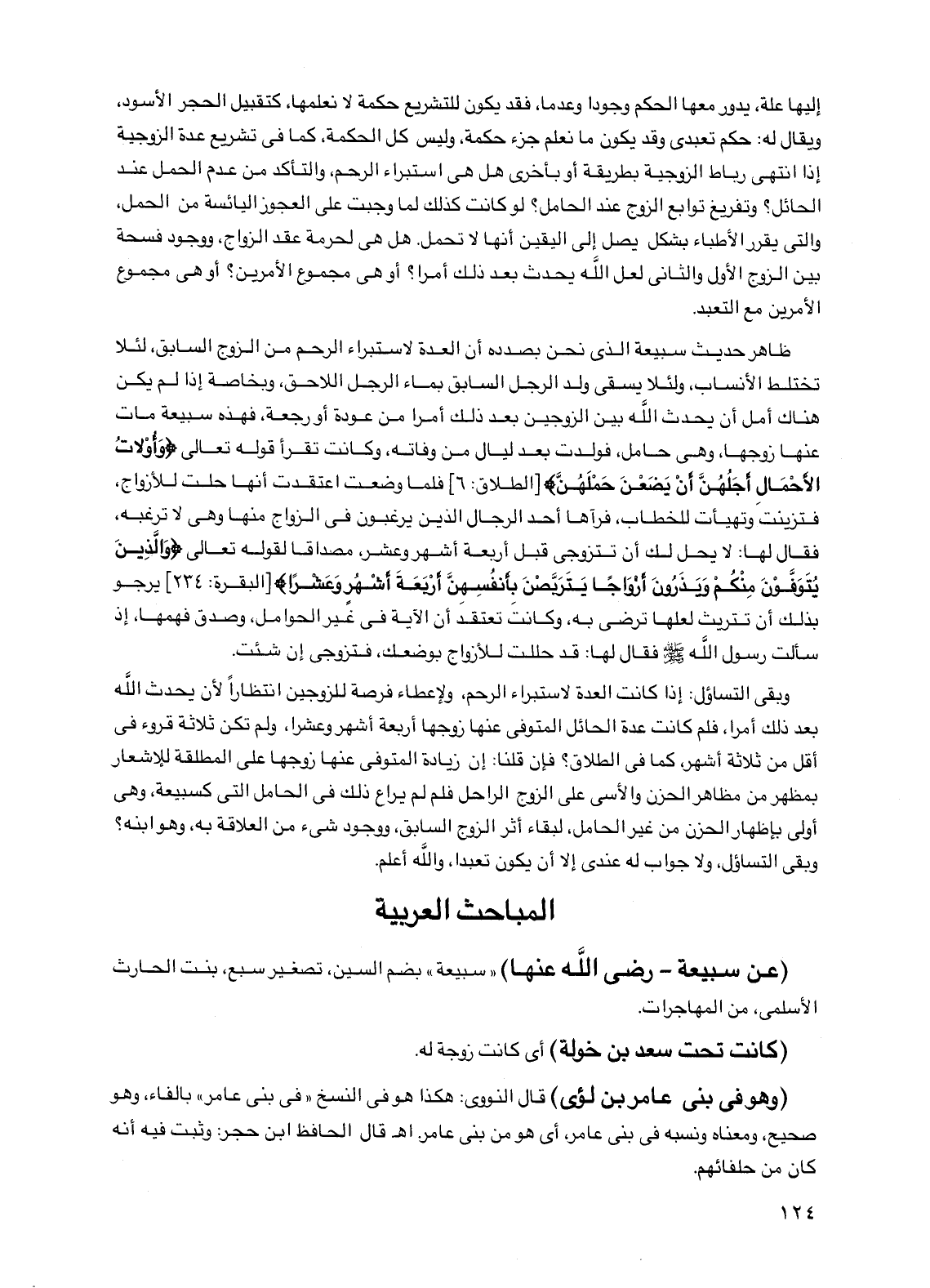 وبقي التساؤل: إذا كانت العدة لاستبراء الرحم، ولإعطاء فرصة للزوجين انتظارًا لأن يحدث الله بعد ذلك أمرًا، فلم كانت عدة الحائل المتوفى عنها زوجها أربعة أشهر وعشرًا، ولم تكن ثلاثة قروء في أقل من ثلاثة أشهر، كما في الطلاق؟ فإن قلنا: إن زيادة المتوفى عنها زوجها على المطلقة للإشعار بمظهر من مظاهر الحزن والأسى على الزوج الراحل فلم لم يراع ذلك في الحامل التي كسبيعة، وهي أولى بإظهار الحزن من غير الحامل، لبقاء أثر الزوج السابق، ووجود شيء من العلاقة به، وهو ابنه؟ وبقي التساؤل، ولا جواب له عندي إلا أن يكون تعبدًا، والله أعلم.