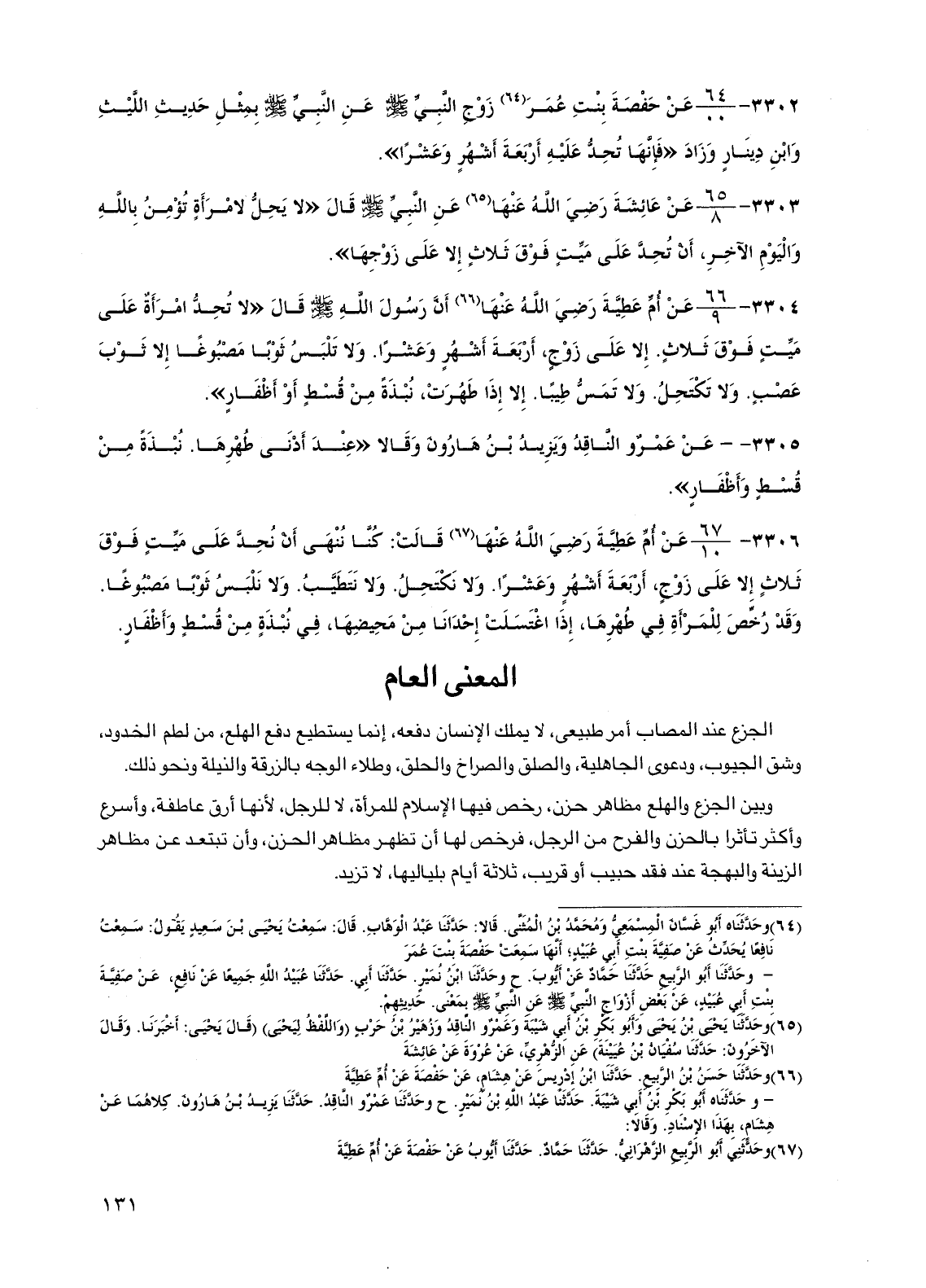 3302 - عن حفصة بنت عمر زوج النبي صلى الله عليه وسلم عن النبي صلى الله عليه وسلم بمثل حديث الليث وابن دينار وزاد "فإنها تحد عليه أربعة أشهر وعشرًا".