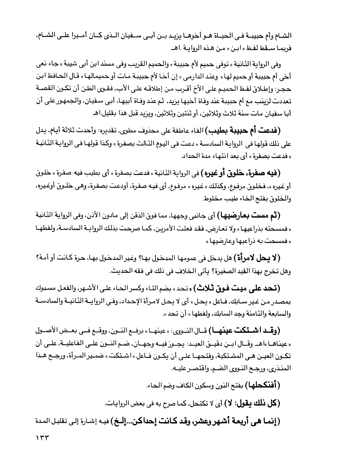 (تحد على ميت فوق ثلاث) "تحد" بضم التاء وكسر الحاء على الأشهر، والفعل مسبوك بمصدر من غير سابك، فاعل "يحل" أي لا يحل لامرأة الإحداد، وفي الرواية الثانية والسادسة والسابعة والثامنة وجد السابك، ولفظها "أن تحد".