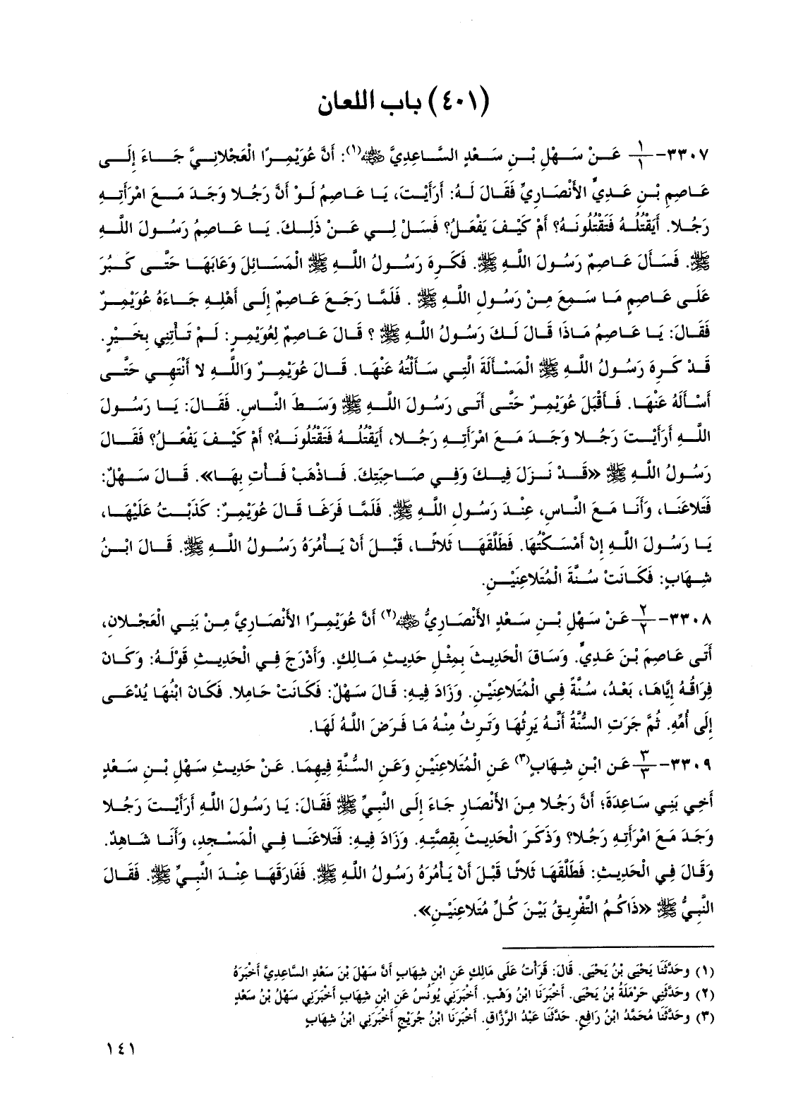 3309 - عن ابن شهاب عن المتلاعنين وعن السنة فيهما. عن حديث سهل بن سعد أخي بني ساعدة؛ أن رجلاً من الأنصار جاء إلى النبي صلى الله عليه وسلم فقال: يا رسول الله أرأيت رجلاً وجد مع امرأته رجلاً؟ وذكر الحديث بقصته. وزاد فيه: فتلاعنا في المسجد، وأنا شاهد. وقال في الحديث: فطلقها ثلاثًا قبل أن يأمره رسول الله صلى الله عليه وسلم. ففارقها عند النبي صلى الله عليه وسلم. فقال النبي صلى الله عليه وسلم "ذاكم التفريق بين كل متلاعنين".