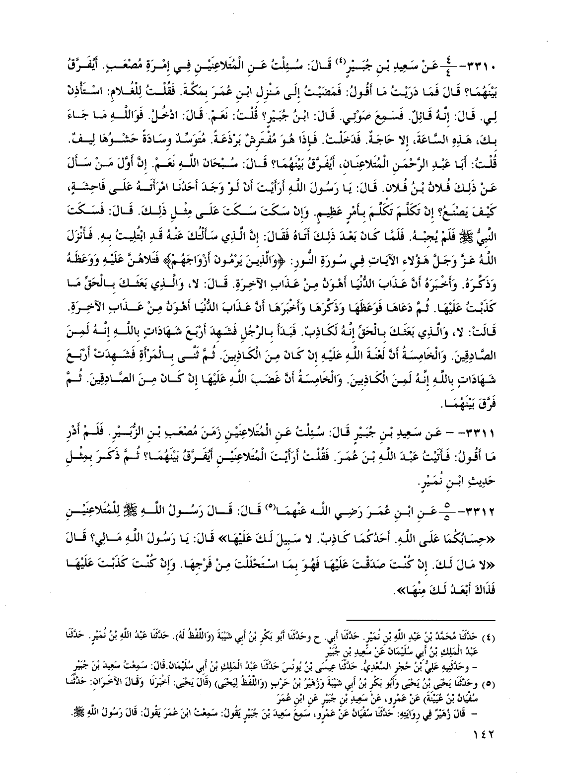 3310 - عن سعيد بن جبير قال: سئلت عن المتلاعنين في إمرة مصعب. أيفرق بينهما؟ قال فما دريت ما أقول: فمضيت إلى منزل ابن عمر بمكة. فقلت للغلام: استأذن لي. قال: إنه قائل. فسمع صوتي. قال: ابن جبير؟ قلت: نعم. قال: ادخل. فوالله ما جاء بك، هذه الساعة، إلا حاجة. فدخلت. فإذا هو مفترش برذعة. متوسد وسادة حشوها ليف. قلت: أبا عبد الرحمن المتلاعنان، أيفرق بينهما؟ قال: سبحان الله نعم. إن أول من سأل عن ذلك فلان بن فلان. قال: يا رسول الله أرأيت أن لو وجد أحدنا امرأته على فاحشة، كيف يصنع؟ إن تكلم تكلم بأمر عظيم. وإن سكت سكت على مثل ذلك. قال: فسكت النبي صلى الله عليه وسلم فلم يجبه. فلما كان بعد ذلك أتاه فقال: إن الذي سألتك عنه قد ابتليت به. فأنزل الله عز وجل هؤلاء الآيات في سورة النور: {والذين يرمون أزواجهم} فتلاهن عليه ووعظه وذكره. وأخبره أن عذاب الدنيا أهون من عذاب الآخرة. قال: لا، والذي بعثك بالحق ما كذبت عليها. ثم دعاها فوعظها وذكرها وأخبرها أن عذاب الدنيا أهون من عذاب الآخرة. قالت: لا، والذي بعثك بالحق إنه لكاذب. فبدأ بالرجل فشهد أربع شهادات بالله إنه لمن الصادقين. والخامسة أن لعنة الله عليه إن كان من الكاذبين. ثم ثنى بالمرأة فشهدت أربع شهادات بالله إنه لمن الكاذبين. والخامسة أن غضب الله عليها إن كان من الصادقين. ثم فرق بينهما.