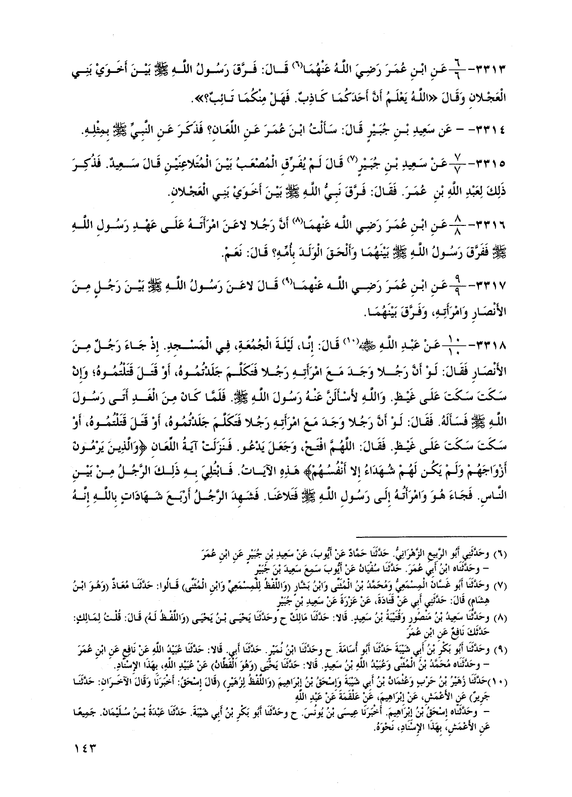 3313 - عن ابن عمر رضي الله عنهما قال: فرق رسول الله صلى الله عليه وسلم بين أخوي بني العجلان وقال "الله يعلم أن أحدكما كاذب. فهل منكما تائب؟ ".