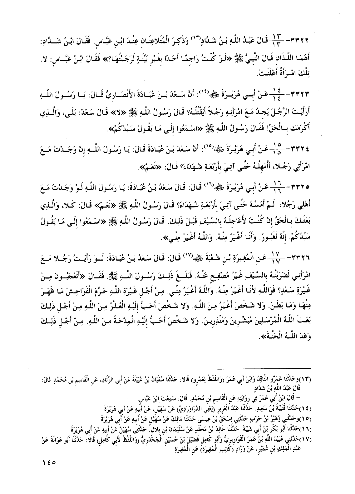 3325 - عن أبي هريرة رضي الله عنه قال: قال سعد بن عبادة: يا رسول الله لو وجدت مع أهلي رجلاً، لم أمسه حتى آتي بأربعة شهداء؟ قال رسول الله صلى الله عليه وسلم "نعم" قال: كلا، والذي بعثك بالحق إن كنت لأعاجله بالسيف قبل ذلك. قال رسول الله صلى الله عليه وسلم "اسمعوا إلى ما يقول سيدكم. إنه لغيور. وأنا أغير منه. والله أغير مني".