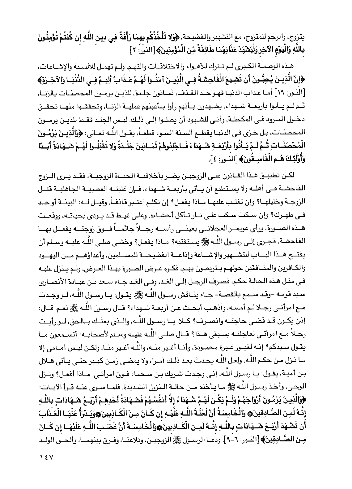 لكن تطبيق هذا القانون على الزوجين يضر بأخلاقية الحياة الزوجية، فقد يرى الزوج الفاحشة في أهله ولا يستطيع أن يأتي بأربعة شهداء، فإن غلبته العصبية الجاهلية قتل الزوجة وخليلها؟ وإن تغلب عليها ماذا يفعل؟ إن تكلم اعتبر قاذفًا، وقيل له: البينة أو حد في ظهرك؟ وإن سكت سكت على نار تأكل أحشاءه، وعلى غيظ قد يودي بحياته، ووقعت هذه الصورة، ورأى عويمر العجلاني بعينى رأسه رجلاً جاثمًا فوق زوجته يفعل بها الفاحشة، فجرى إلى رسول الله صلى الله عليه وسلم يستفتيه؟ ماذا يفعل؟ وخشي صلى الله عليه وسلم أن يفتح هذا الباب للتشهير والإشاعة وإذاعة الفضيحة للمسلمين، وأعداؤهم من اليهود والكافرين والمنافقين حولهم يتربصون بهم، فكره عرض الصورة بهذا العرض، ولم ينزل عليه في مثل هذه الحالة حكم، فصرف الرجل إلى الغد، وفي الغد جاء سعد بن عبادة الأنصاري سيد قومه - وقد سمع بالقصة - جاء يناقش رسول الله صلى الله عليه وسلم. يقول: يا رسول الله، لو وجدت مع امرأتي رجلاً لم أمسه، وأذهب أبحث عن أربعة شهداء؟ قال رسول الله صلى الله عليه وسلم نعم. قال: إذن يكون قد قضى حاجته وانصرف؟ كلا. يا رسول الله، والذي بعثك بالحق، لو رأيت رجلاً مع امرأتي لعاجلته بسيفي هذا؟ قال صلى الله عليه وسلم لأصحابه: أتسمعون ما يقول سيدكم؟ إنه لغيور غيرة محمودة، وأنا أغير منه، والله أغير منا، ولكن ليس أمامي إلا ما نزل من حكم الله، ولعل الله يحدث بعد ذلك أمرًا، ولا يمضي زمن كبير حتى يأتي هلال بن أمية، يقول: يا رسول الله، إني وجدت شريك بن سحماء فوق امرأتي. ماذا أفعل؟ ونزل الوحي، وأخذ رسول الله صلى الله عليه وسلم ما يأخذه من حالة النزول الشديدة.