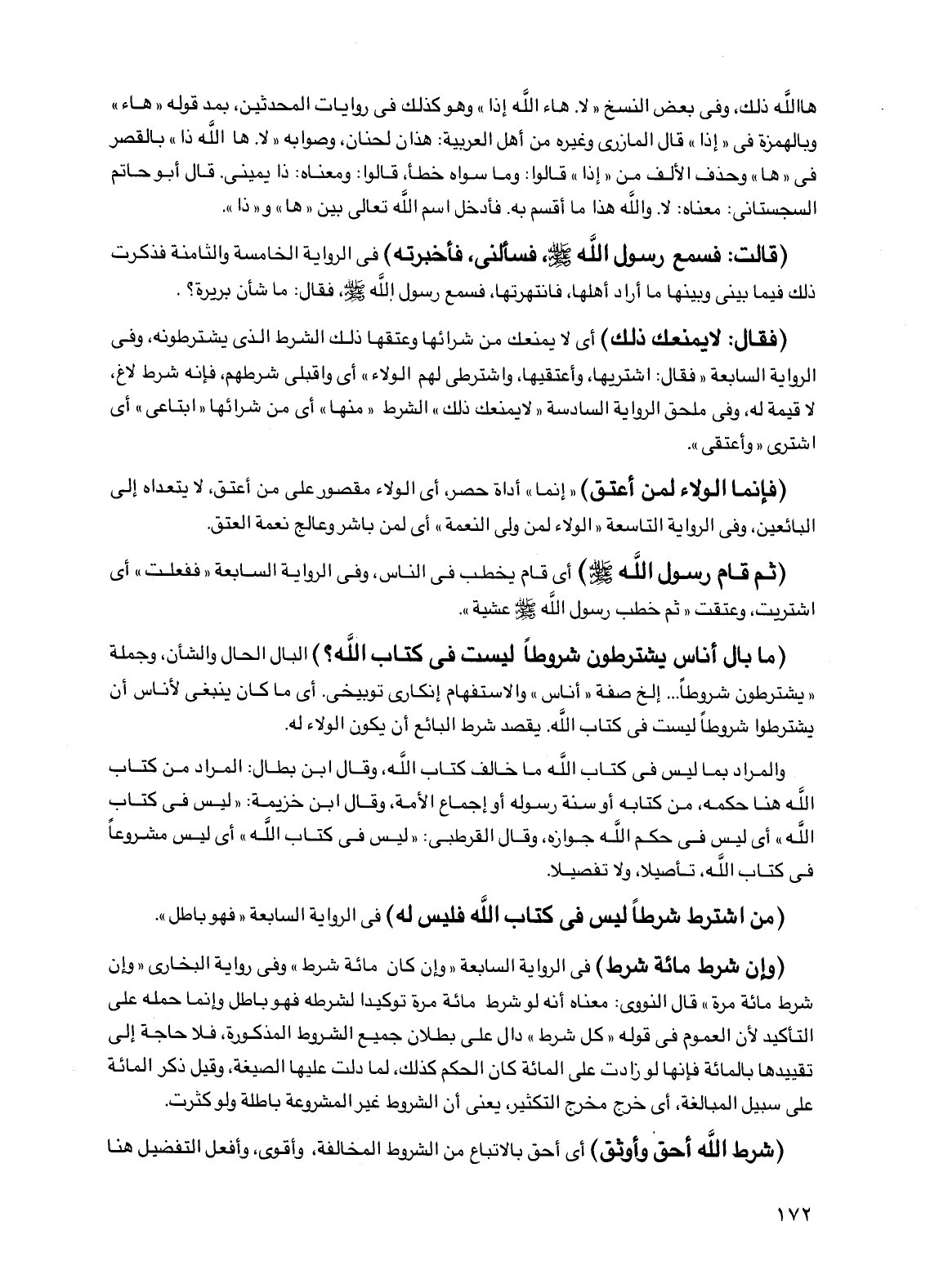 (ما بال أناس يشترطون شروطا ليست في كتاب الله؟ ) البال الحال والشأن، وجملة "يشترطون شروطًا ... إلخ صفة "أناس" والاستفهام إنكاري توبيخي. أي ما كان ينبغي لأناس أن يشترطوا شروطًا ليست في كتاب الله. يقصد شرط البائع أن يكون الولاء له.