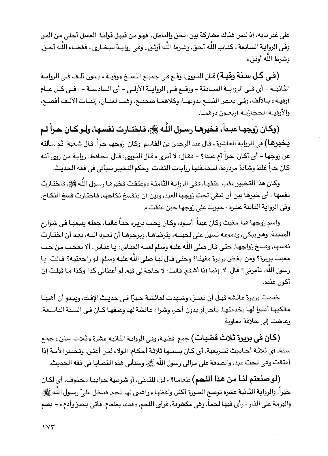 (كان في بريرة ثلاث قضيات) جمع قضية، وفي الرواية الثانية عشرة "ثلاث سنن" جمع سنة، أي ثلاثة أحاديث تشريعية، أي كان بسببها ثلاثة أحكام. الولاء لمن أعتق، وتخيير الأمة إذا أعتقت وهي تحت عبد، والصدقة على موالي رسول الله صلى الله عليه وسلم. وستأتي هذه القضايا في فقه الحديث.