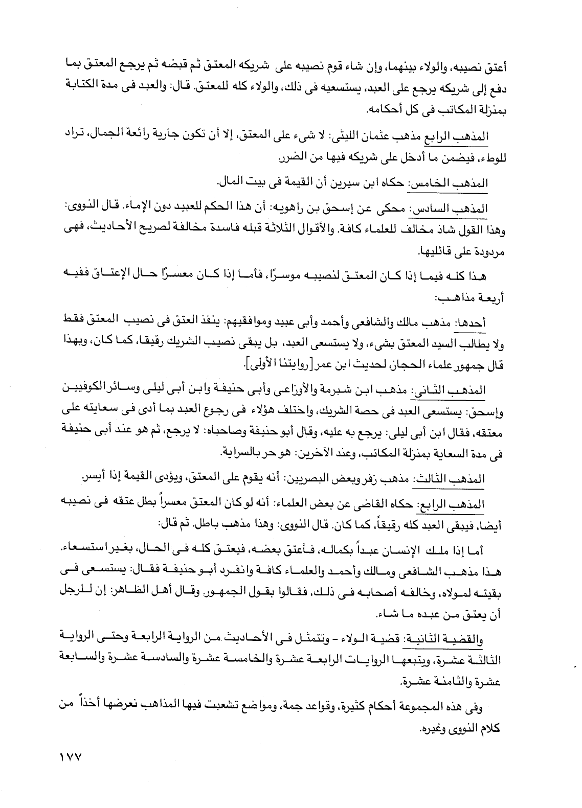 أحدها: مذهب مالك والشافعي وأحمد وأبي عبيد وموافقيهم: ينفذ العتق في نصيب المعتق فقط ولا يطالب السيد المعتق بشيء، ولا يستسعى العبد، بل يبقى نصيب الشريك رقيقًا، كما كان، وبهذا قال جمهور علماء الحجاز، لحديث ابن عمر [روايتنا الأولى].