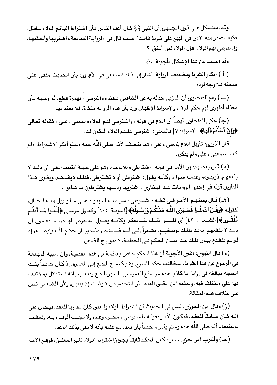 (ز) وقال ابن الجوزي: ليس في الحديث أن اشتراط الولاء والعتق كان مقارنًا للعقد، فيحمل على أنه كان سابقًا للعقد، فيكون الأمر بقوله "اشترطي" مجرد وعد، ولا يجب الوفاء به. وتعقب باستبعاد أنه صلى الله عليه وسلم يأمر شخصًا بأن يعد، مع علمه بأنه لا يفي بذلك الوعد.