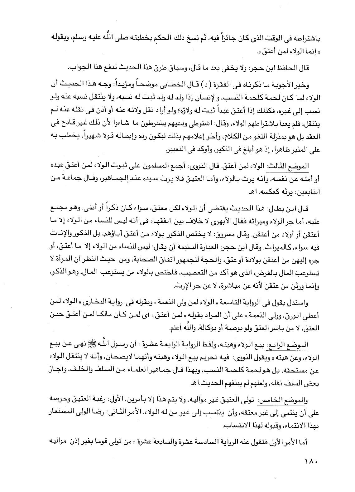 الموضع الرابع: بيع الولاء وهبته، ولفظ الرواية الرابعة عشرة "أن رسول الله صلى الله عليه وسلم نهى عن بيع الولاء، وعن هبته" ويقول النووي: فيه تحريم بيع الولاء وهبته وأنهما لا يصحان، وأنه لا ينتقل الولاء عن مستحقه، بل هو لحمة كلحمة النسب، وبهذا قال جماهير العلماء من السلف والخلف، وأجاز بعض السلف نقله، ولعلهم لم يبلغهم الحديث. اهـ.