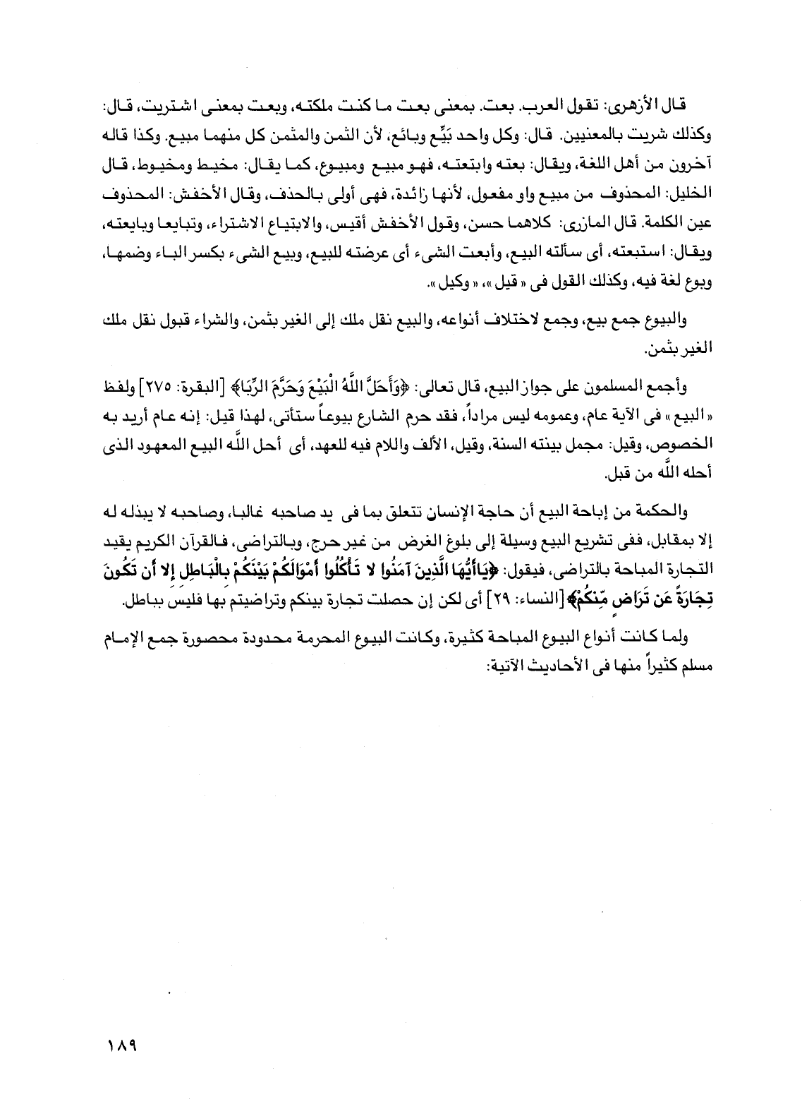 وأجمع المسلمون على جواز البيع، قال تعالى: {وأحل الله البيع وحرم الربا} [البقرة: 275] ولفظ "البيع" في الآية عام، وعمومه ليس مرادًا، فقد حرم الشارع بيوعًا ستأتي، لهذا قيل: إنه عام أريد به الخصوص، وقيل: مجمل بينته السنة، وقيل، الألف واللام فيه للعهد، أي أحل الله البيع المعهود الذي أحله الله من قبل.