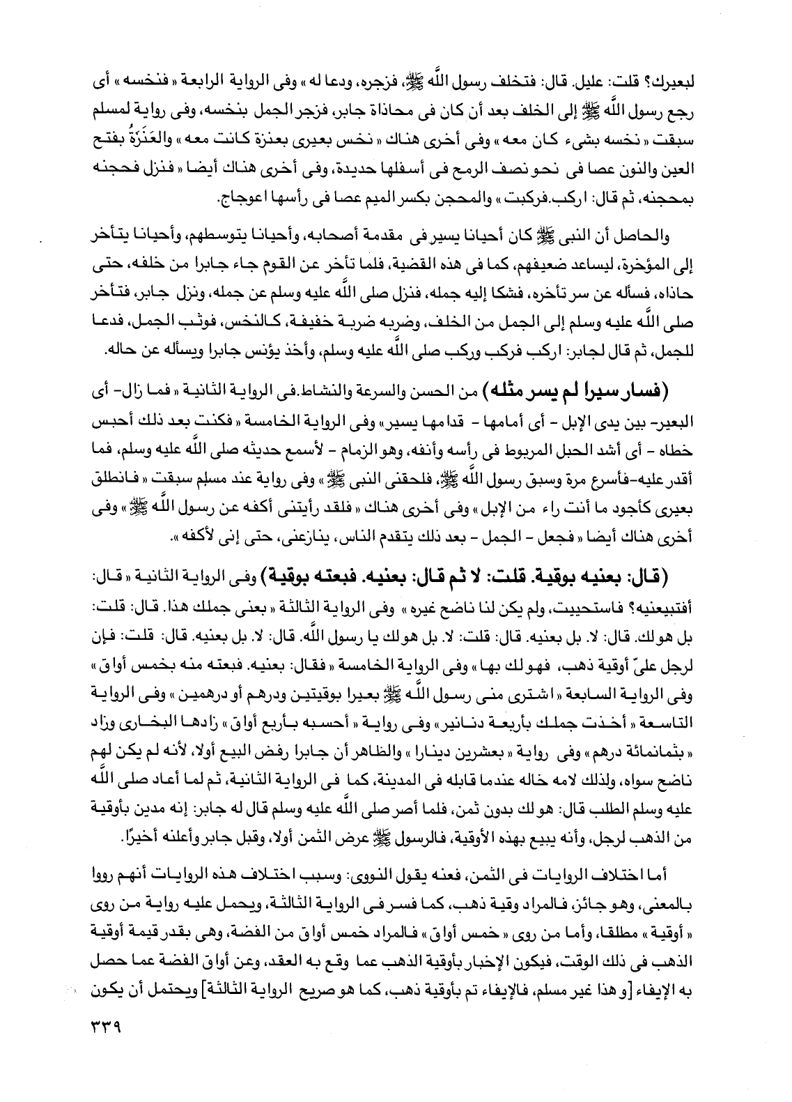 (قال: بعنيه بوقية. قلت: لا ثم قال: بعنيه. فبعته بوقية) وفي الرواية الثانية "قال: أفتبيعنيه؟ فاستحييت، ولم يكن لنا ناضح غيره" وفي الرواية الثالثة "بعني جملك هذا. قال: قلت: بل هو لك. قال: لا. بل بعنيه. قال: قلت: لا. بل هو لك يا رسول الله. قال: لا. بل بعنيه. قال: قلت: فإن لرجل علي أوقية ذهب، فهو لك بها" وفي الرواية الخامسة "فقال: بعنيه. فبعته منه بخمس أواق" وفي الرواية السابعة "اشترى مني رسول الله صلى الله عليه وسلم بعيرًا بوقيتين ودرهم أو درهمين" وفي الرواية التاسعة "أخذت جملك بأربعة دنانير" وفي رواية "أحسبه بأربع أواق" زادها البخاري وزاد "بثمانمائة درهم" وفي رواية "بعشرين دينارًا" والظاهر أن جابرًا رفض البيع أولاً، لأنه لم يكن لهم ناضح سواه، ولذلك لامه خاله عندما قابله في المدينة، كما في الرواية الثانية، ثم لما أعاد صلى الله عليه وسلم الطلب قال: هو لك بدون ثمن، فلما أصر صلى الله عليه وسلم قال له جابر: إنه مدين بأوقية من الذهب لرجل، وأنه يبيع بهذه الأوقية، فالرسول صلى الله عليه وسلم عرض الثمن أولاً، وقبل جابر وأعلنه أخيرًا.