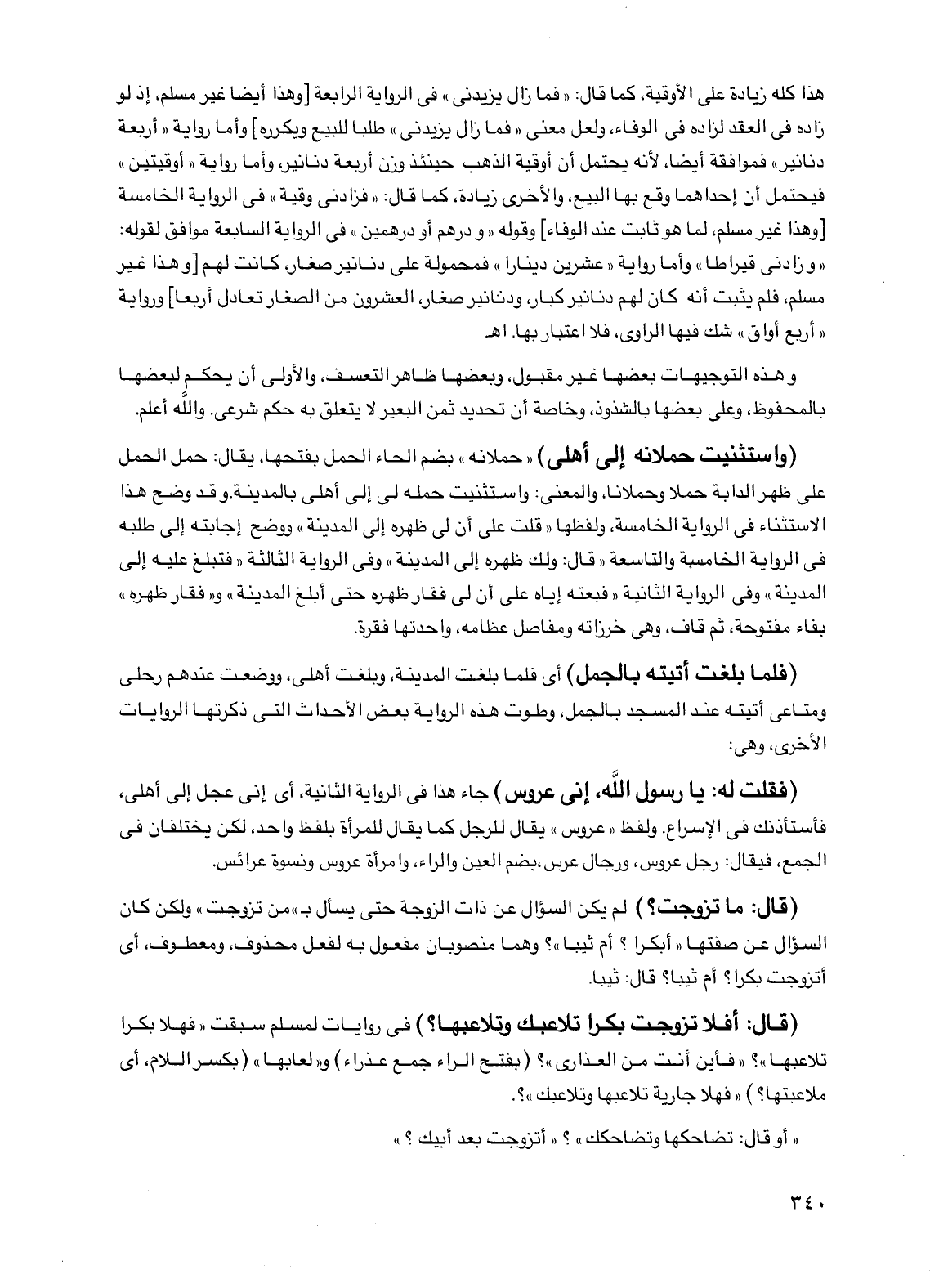 (واستثنيت حملانه إلى أهلي) "حملانه" بضم الحاء الحمل بفتحها، يقال: حمل الحمل على ظهر الدابة حملاً وحملانًا، والمعنى: واستثنيت حمله لي إلى أهلي بالمدينة. وقد وضح هذا الاستثناء في الرواية الخامسة، ولفظها "قلت على أن لي ظهره إلى المدينة" ووضح إجابته إلى طلبه في الرواية الخامسة والتاسعة "قال: ولك ظهره إلى المدينة" وفي الرواية الثالثة "فتبلغ عليه إلى المدينة" وفي الرواية الثانية "فبعته إياه على أن لي فقار ظهره حتى أبلغ المدينة" و"فقار ظهره" بفاء مفتوحة، ثم قاف، وهي خرزاته ومفاصل عظامه، واحدتها فقرة.