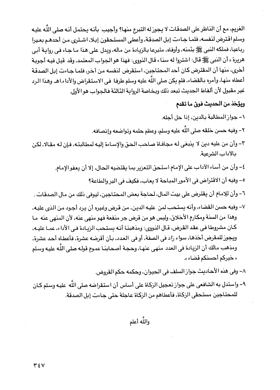 9 - واستدل به الشافعي على جواز تعجيل الزكاة على أساس أن استقراضه صلى الله عليه وسلم كان للمحتاجين مستحقي الزكاة، فأعطاهم من الزكاة عاجلة حتى جاءت إبل الصدقة.