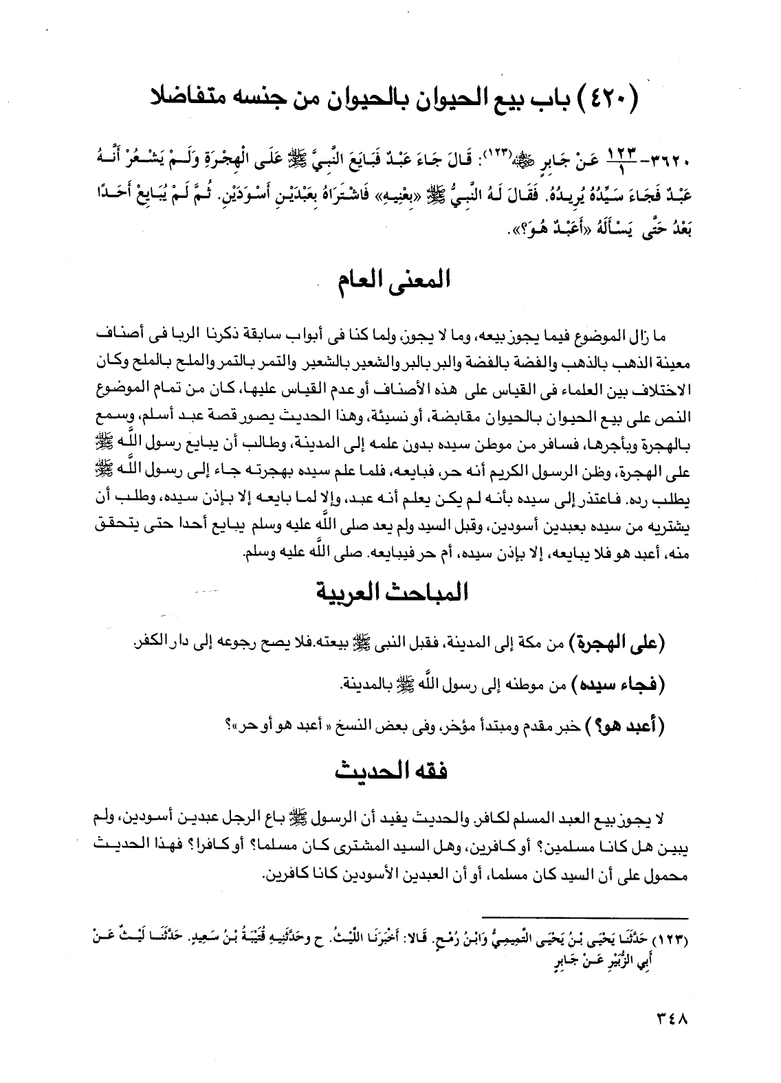 مازال الموضوع فيما يجوز بيعه، وما لا يجوز، ولما كنا في أبواب سابقة ذكرنا الربا في أصناف معينة الذهب بالذهب والفضة بالفضة والبر بالبر والشعير بالشعير والتمر بالتمر والملح بالملح وكان الاختلاف بين العلماء في القياس على هذه الأصناف أو عدم القياس عليها، كان من تمام الموضوع النص على بيع الحيوان بالحيوان مقابضة، أو نسيئة، وهذا الحديث يصور قصة عبد أسلم، وسمع بالهجرة وبأجرها، فسافر من موطن سيده بدون علمه إلى المدينة، وطالب أن يبايع رسول الله صلى الله عليه وسلم على الهجرة، وظن الرسول الكريم أنه حر، فبايعه، فلما علم سيده بهجرته جاء إلى رسول الله صلى الله عليه وسلم يطلب رده. فاعتذر إلى سيده بأنه لم يكن يعلم أنه عبد، وإلا لما بايعه إلا بإذن سيده، وطلب أن يشتريه من سيده بعبدين أسودين، وقبل السيد ولم يعد صلى الله عليه وسلم يبايع أحدًا حتى يتحقق منه، أعبد هو فلا يبايعه، إلا بإذن سيده، أم حر فيبايعه. صلى الله عليه وسلم.