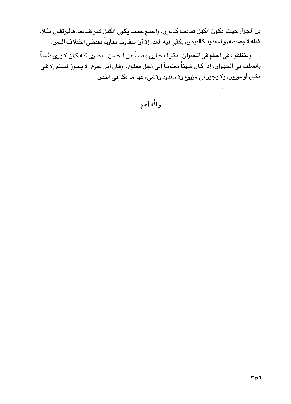 واختلفوا: في السلم في الحيوان، ذكر البخاري معلقًا عن الحسن البصري أنه كان لا يرى بأسًا بالسلف في الحيوان، إذا كان شيئًا معلومًا إلى أجل معلوم، وقال ابن حزم: لا يجوز السلم إلا في مكيل أو موزون، ولا يجوز في مزروع ولا معدود ولا شيء غير ما ذكر في النص.