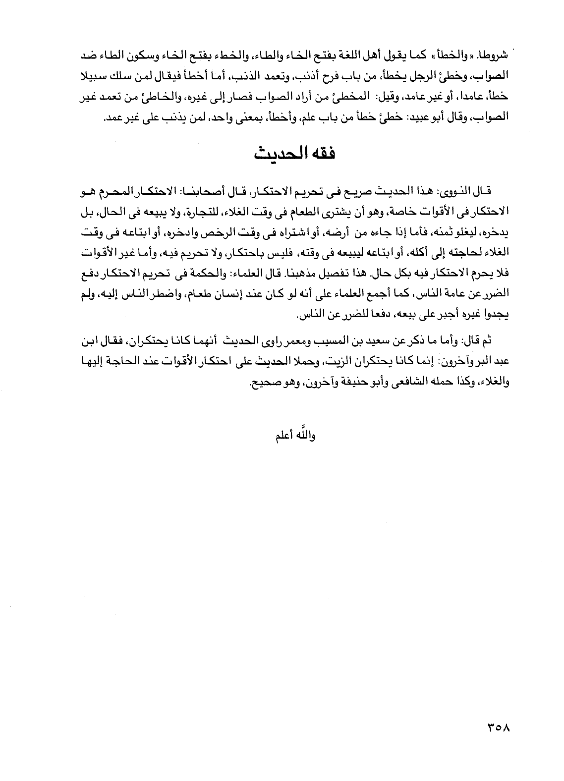 قال النووي: هذا الحديث صريح في تحريم الاحتكار، قال أصحابنا: الاحتكار المحرم هو الاحتكار في الأقوات خاصة، وهو أن يشتري الطعام في وقت الغلاء، للتجارة، ولا يبيعه في الحال، بل يدخره، ليغلو ثمنه، فأما إذا جاءه من أرضه، أو اشتراه في وقت الرخص وادخره، أو ابتاعه في وقت الغلاء لحاجته إلى أكله، أو ابتاعه ليبيعه في وقته، فليس باحتكار، ولا تحريم فيه، وأما غير الأقوات فلا يحرم الاحتكار فيه بكل حال. هذا تفصيل مذهبنا. قال العلماء: والحكمة في تحريم الاحتكار دفع الضرر عن عامة الناس، كما أجمع العلماء على أنه لو كان عند إنسان طعام، واضطر الناس إليه، ولم يجدوا غيره أجبر على بيعه، دفعاً للضرر عن الناس.