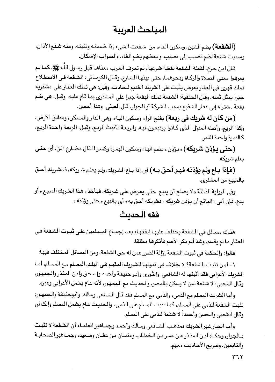 (الشفعة) بضم الشين، وسكون الفاء، من شفعت الشيء إذا ضممته وثنيته، ومنه شفع الأذان، وسميت شفعة لضم نصيب إلى نصيب. وبعضهم يضم الفاء، والصواب الإسكان.
