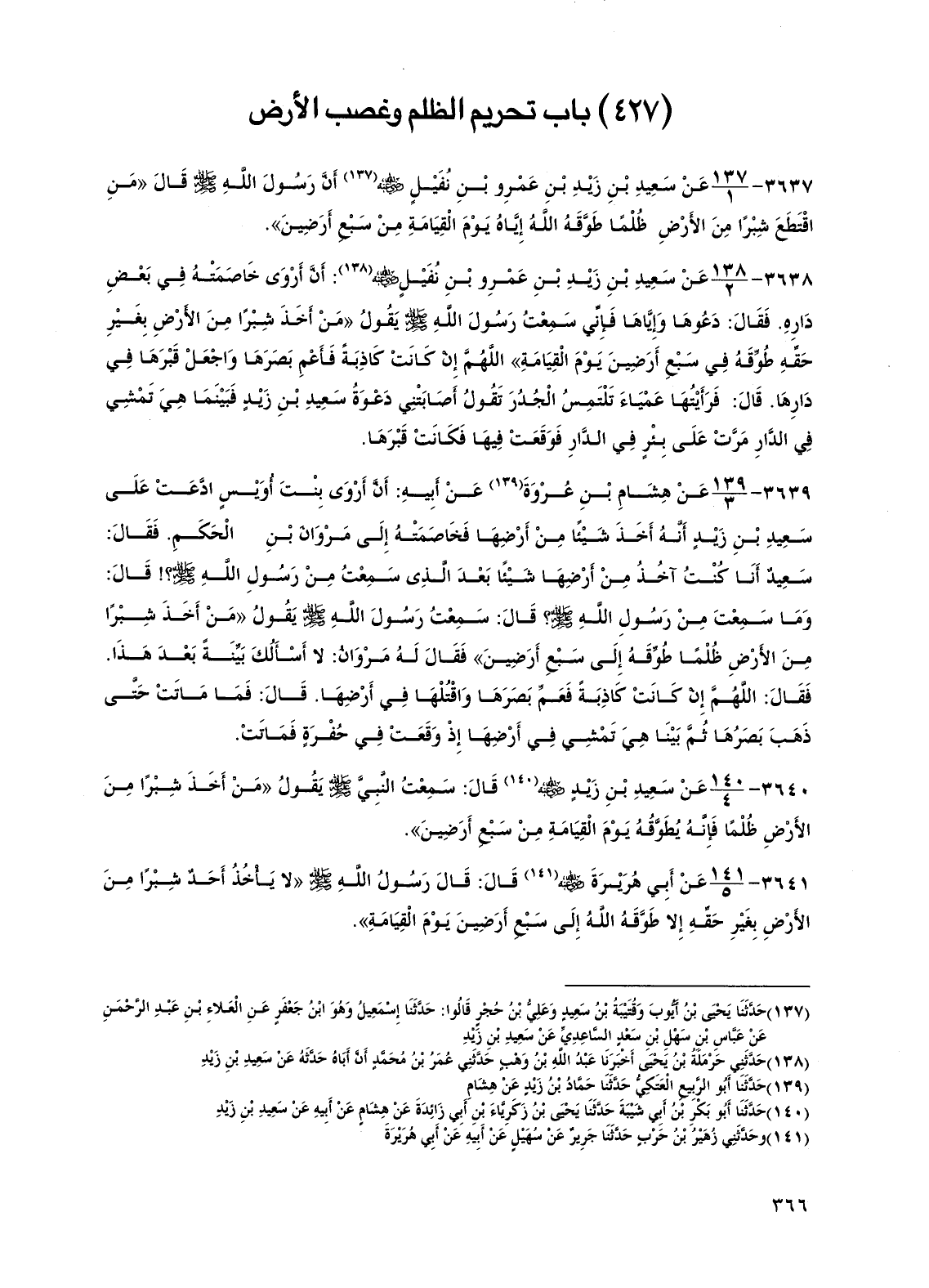 3640 - عن سعيد بن زيد رضي الله عنه قال: سمعت النبي صلى الله عليه وسلم يقول "من أخذ شبرًا من الأرض ظلمًا فإنه يطوقه يوم القيامة من سبع أرضين".