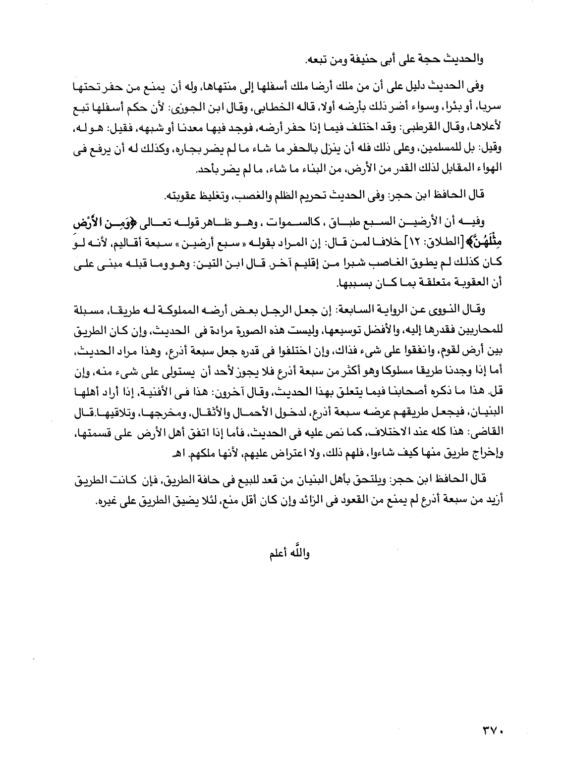 وفي الحديث دليل على أن من ملك أرضًا ملك أسفلها إلى منتهاها، وله أن يمنع من حفر تحتها سربًا، أو بئرًا، وسواء أضر ذلك بأرضه أو لا، قاله الخطابي، وقال ابن الجوزي: لأن حكم أسفلها تبع لأعلاها، وقال القرطبي: وقد اختلف فيما إذا حفر أرضه، فوجد فيها معدنًا أو شبهه، فقيل: هو له، وقيل: بل للمسلمين، وعلى ذلك فله أن ينزل بالحفر ما شاء ما لم يضر بجاره، وكذلك له أن يرفع في الهواء المقابل لذلك القدر من الأرض، من البناء ما شاء، ما لم يضر بأحد.